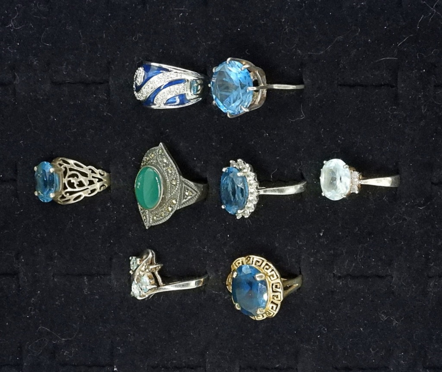 8 BLUE GEMSTONE FASHION RINGS IN STERLING. SIZES 5-8. 30.3 DWT