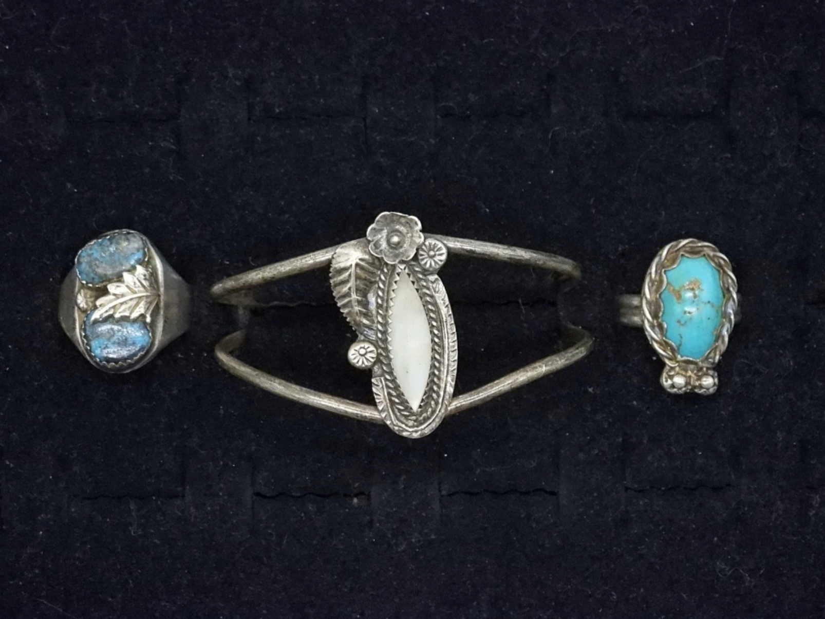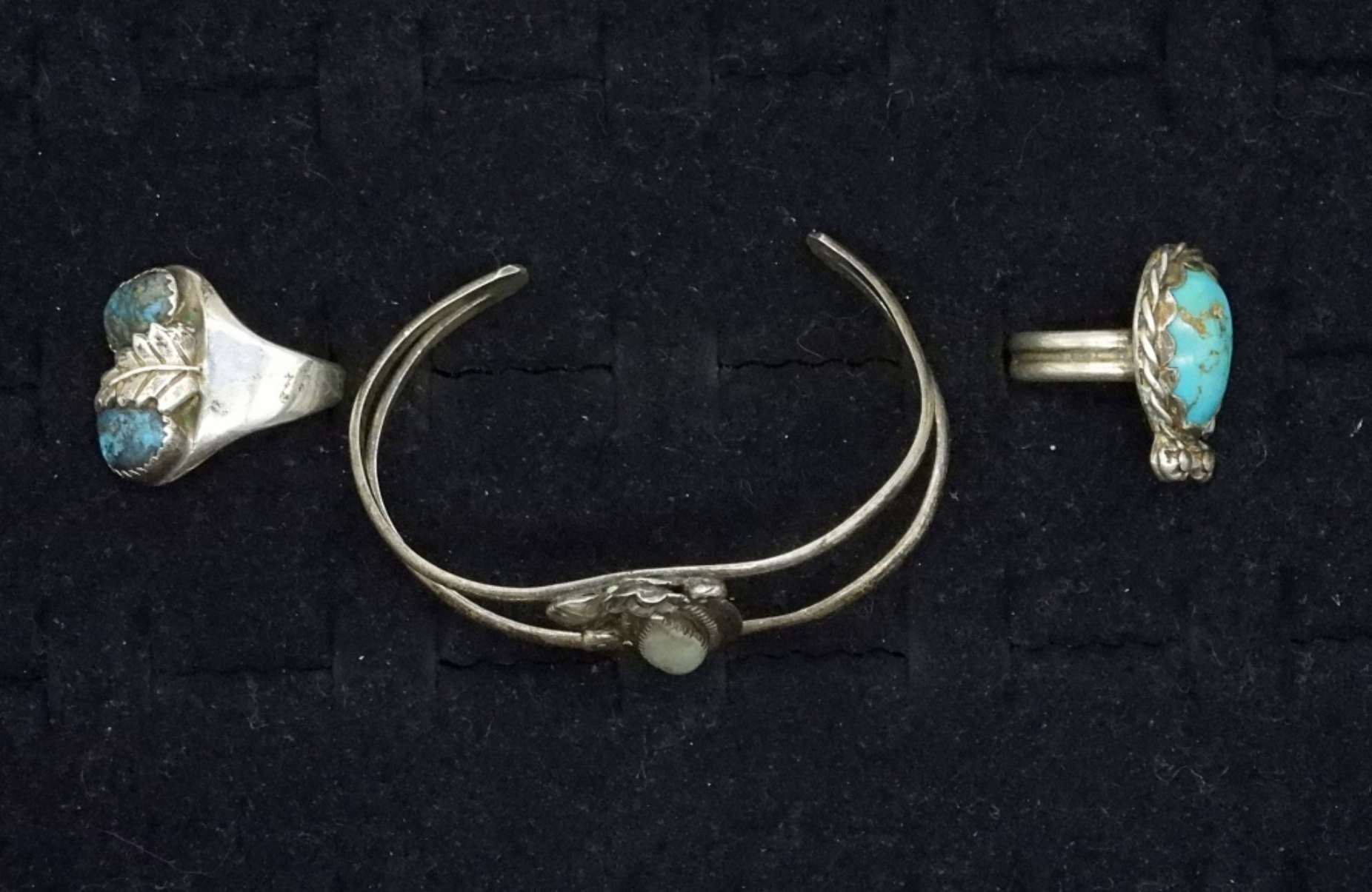 ONE STERLING CUFF STYLE BRACELET, VINTAGE. TWO STERLING RINGS WITH TURQUOISE, SIZES 7 & 9. 17 DWT