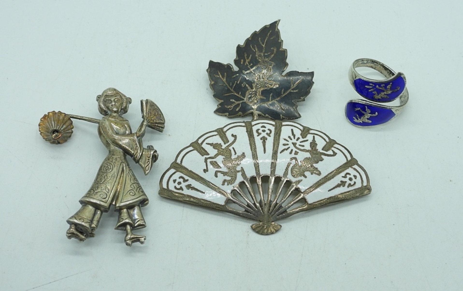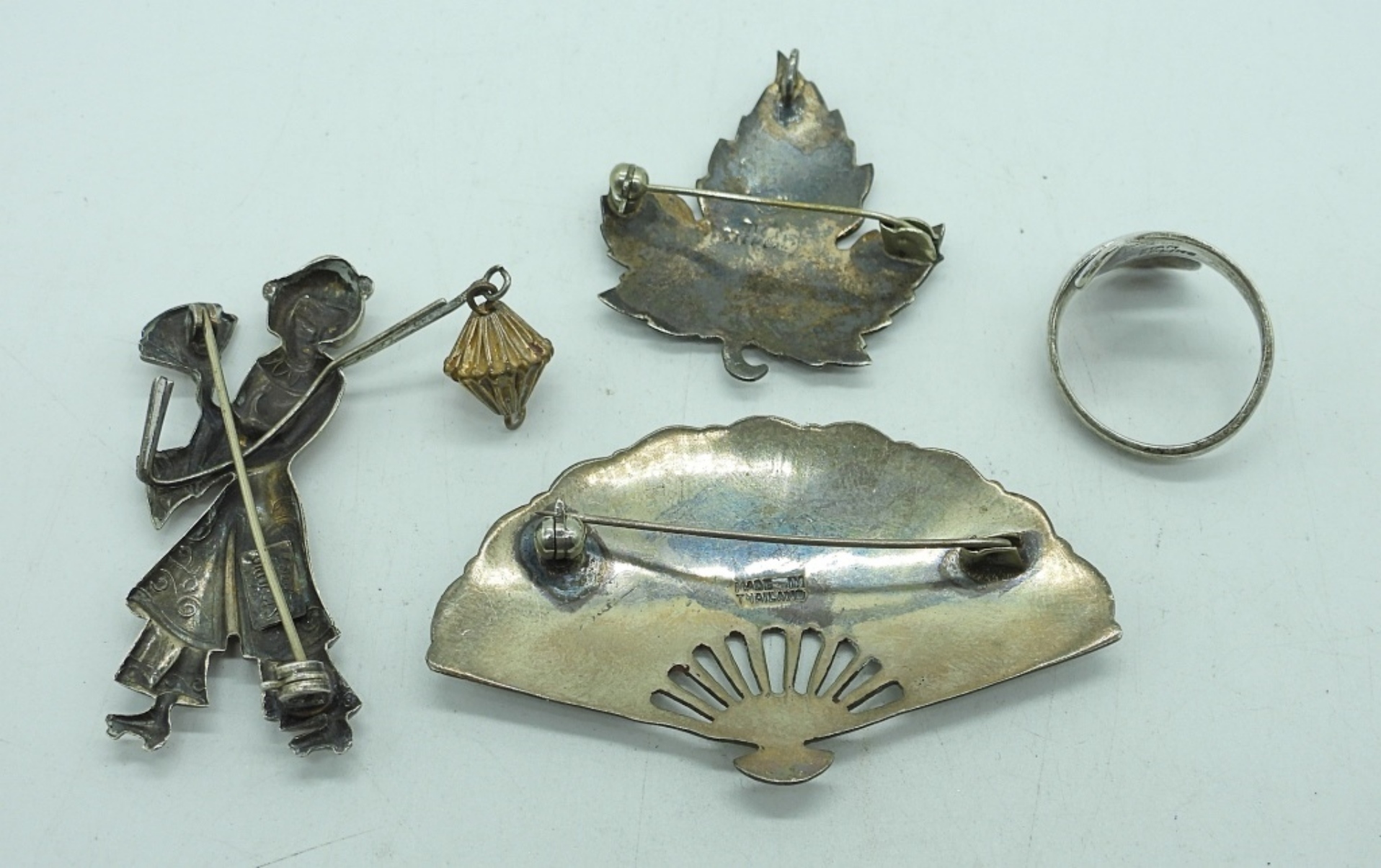 SIAM SILVER RING SIZE 6-7. TWO SIAM STERLING BROOCHES AND A STERLING LANG GEISHA WOMAN BROOCH. 15.5 DWT