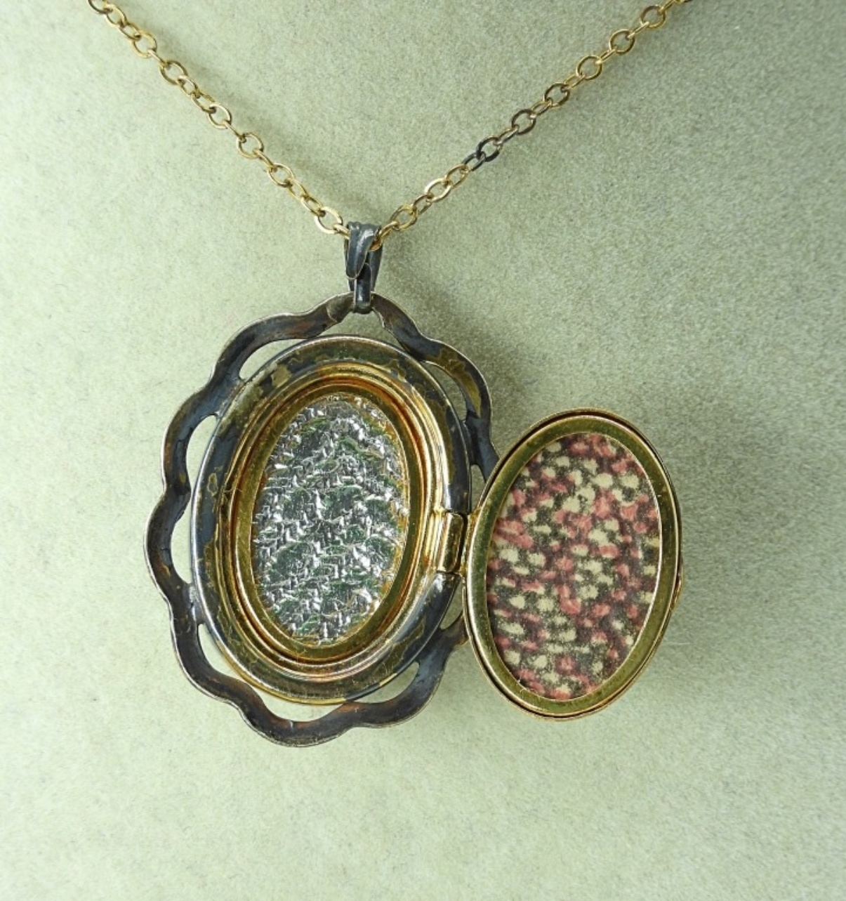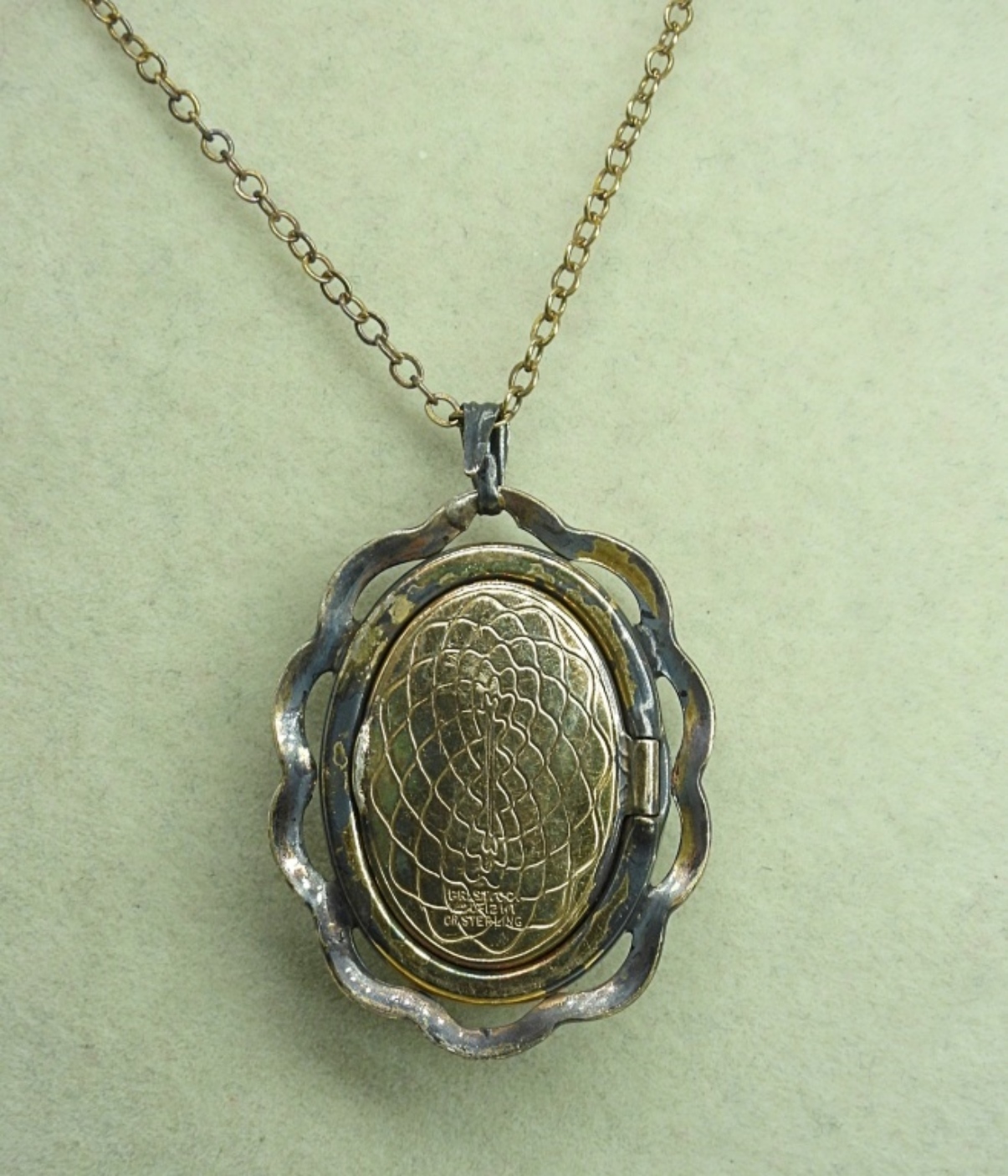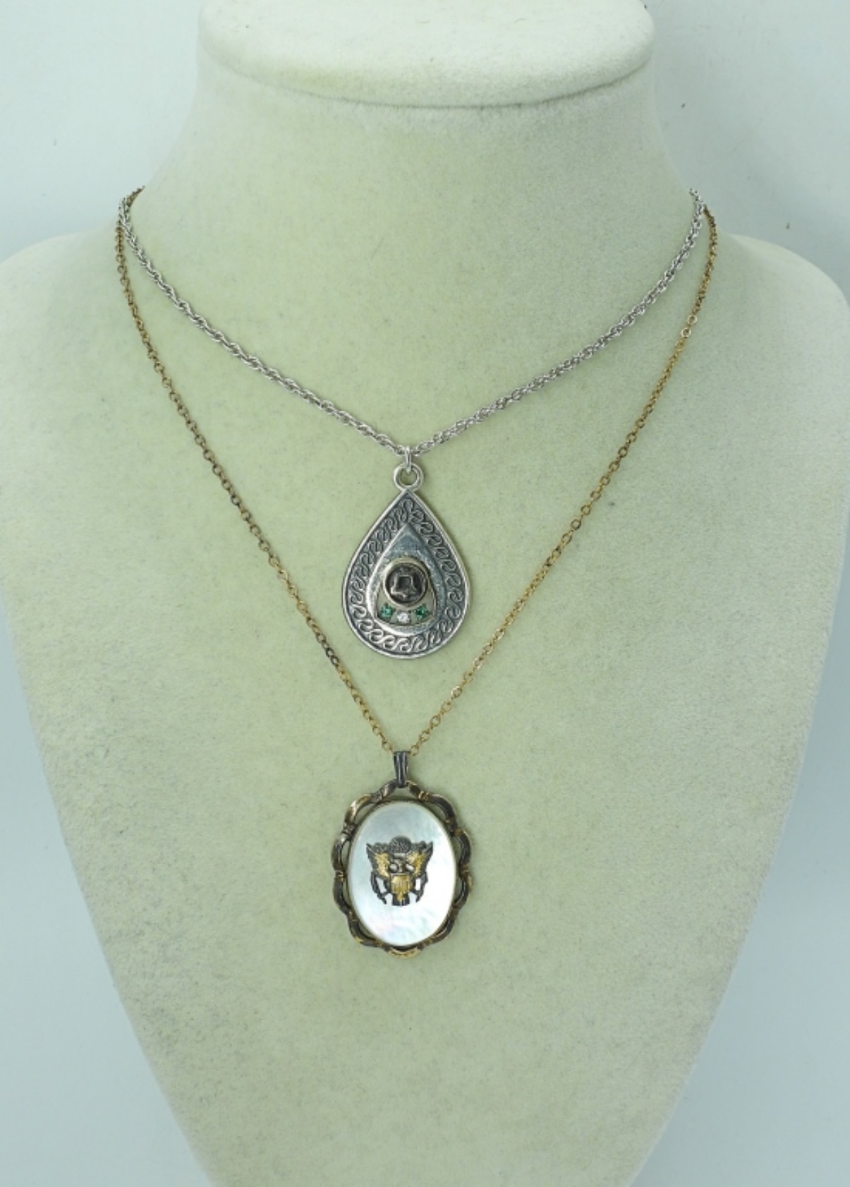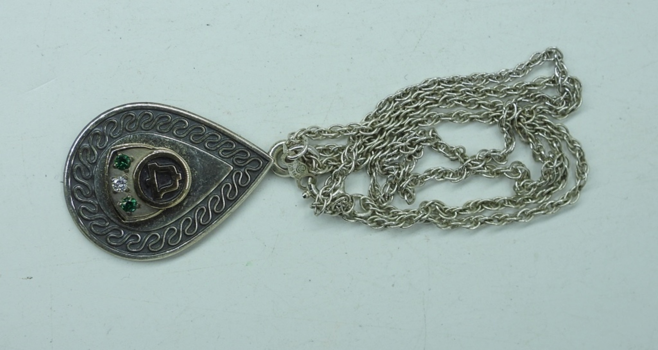 VINTAGE STERLING, WW2 ARMY SWEETHEART MOTHER OF PEARL LOCKET, 18″ CHAIN. BELL PHONE CO STERLING PENDANT WITH DIAMOND & EMERALDS. 18″ STERLING CHAIN. 11.7 DWT