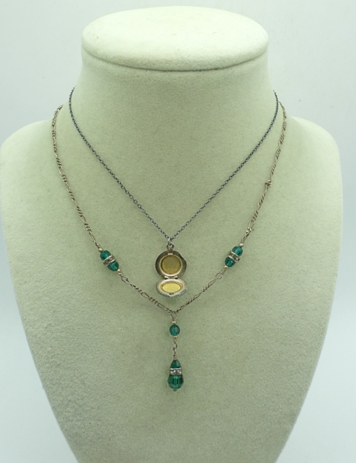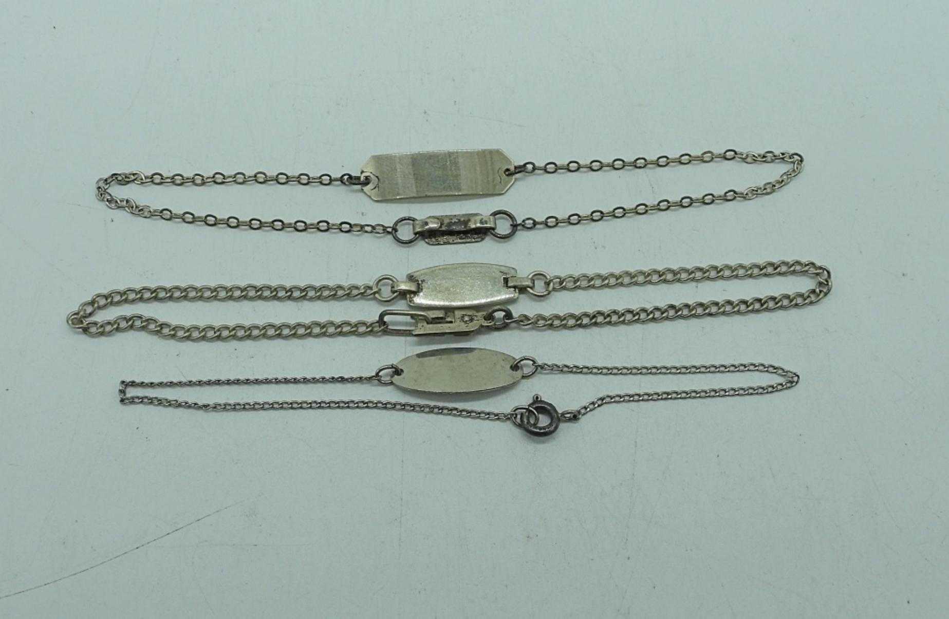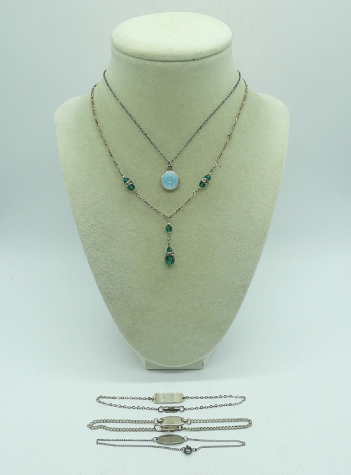 ALL STERLING. THREE OLD, PETITE ID BRACELETS, NOT ENGRAVED, 7.5 / 8 / 8.5″. ONE OLD LOCKET WITH BLUE FRONT, 12″ CHAIN (CLEANED BUT STILL SOME TARNISH). ONE VTG BEADED NECKLACE, 16″. 9 DWT