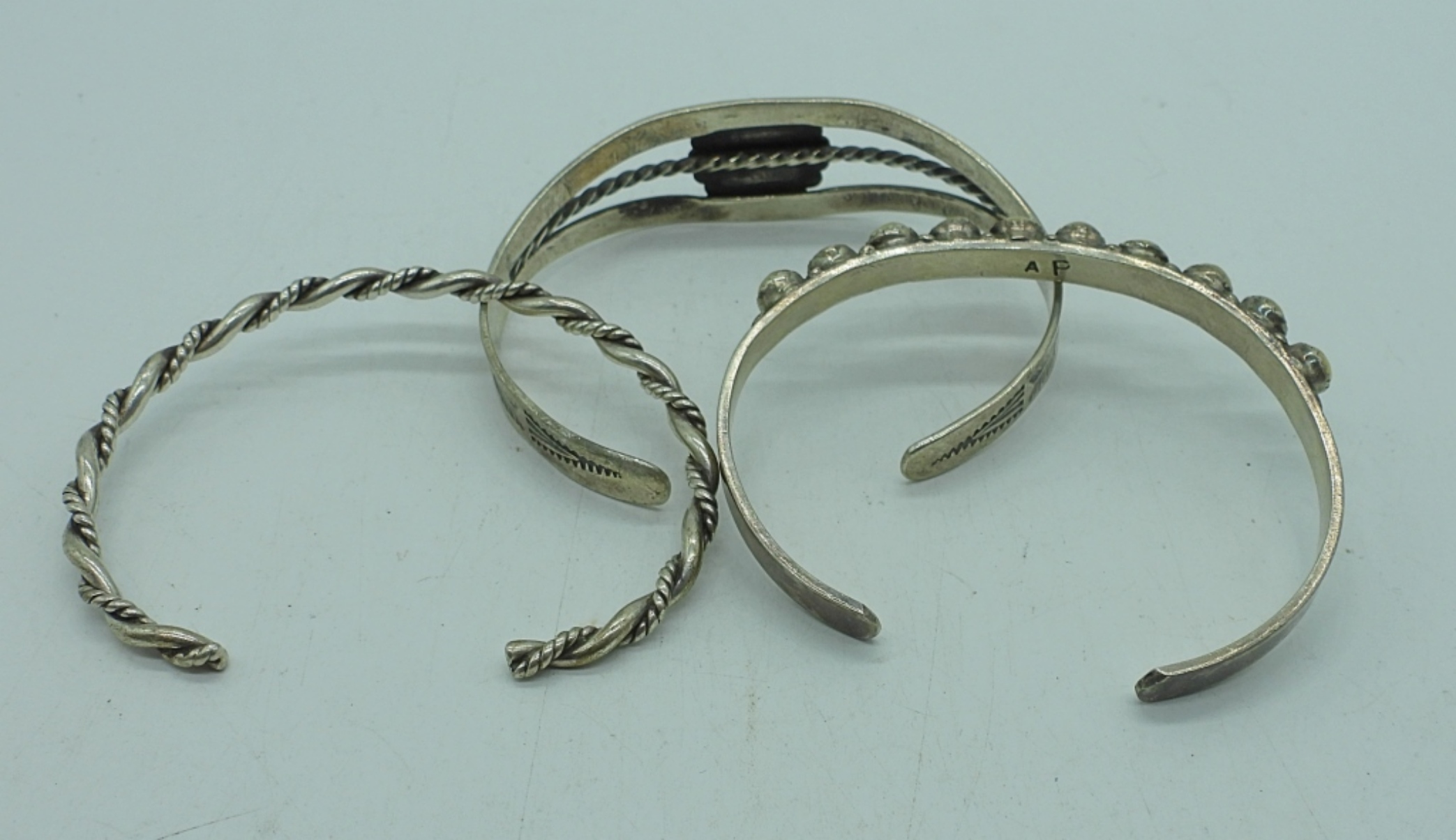 THREE VINTAGE STERLING CUFF BRACELETS, GEMSTONES, 6-7″. 22DWT