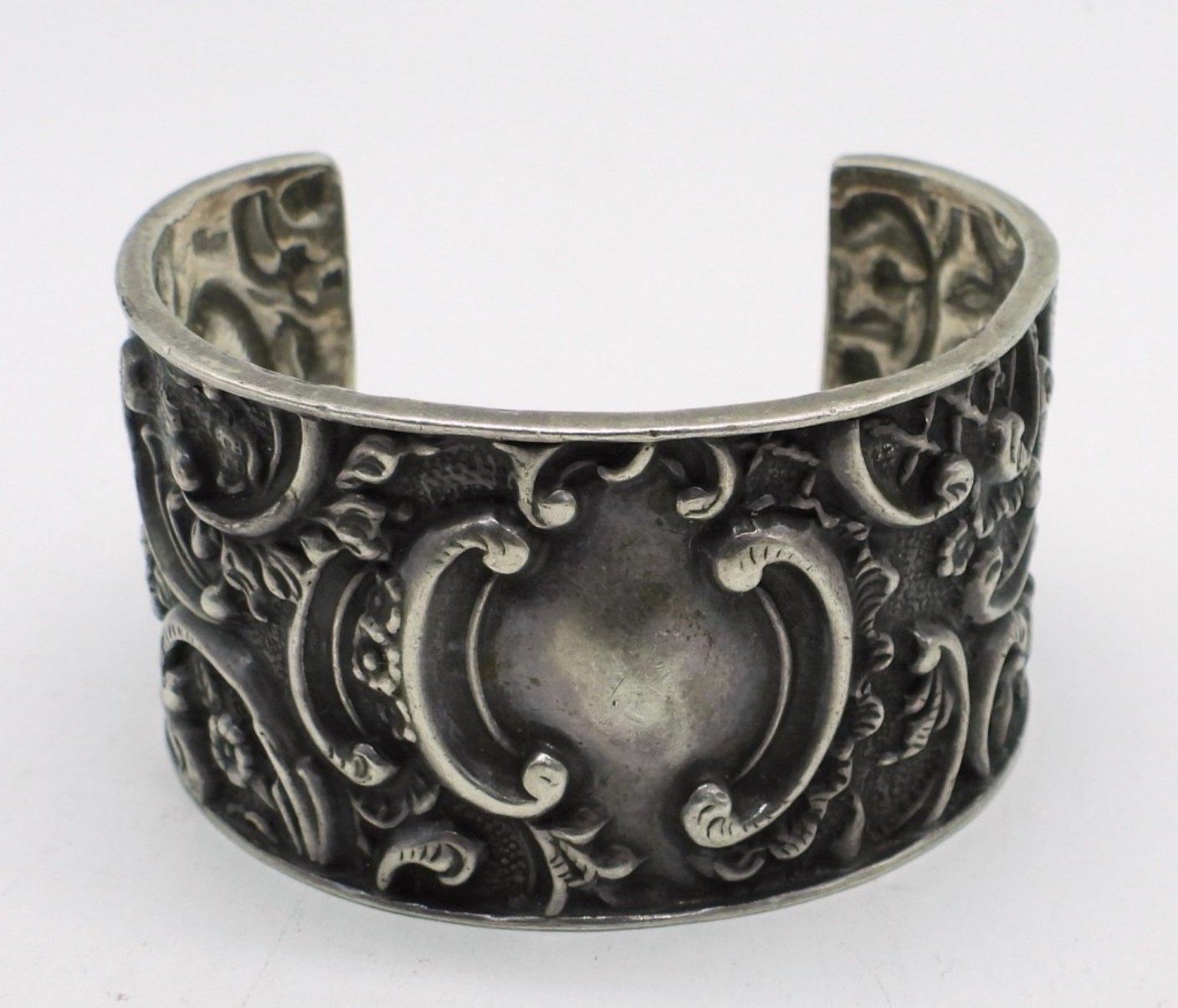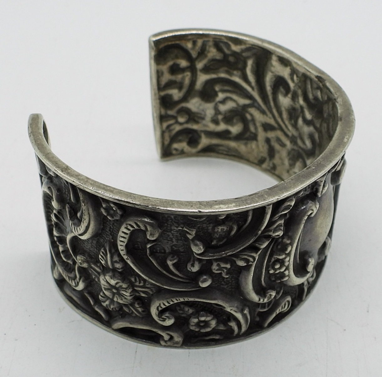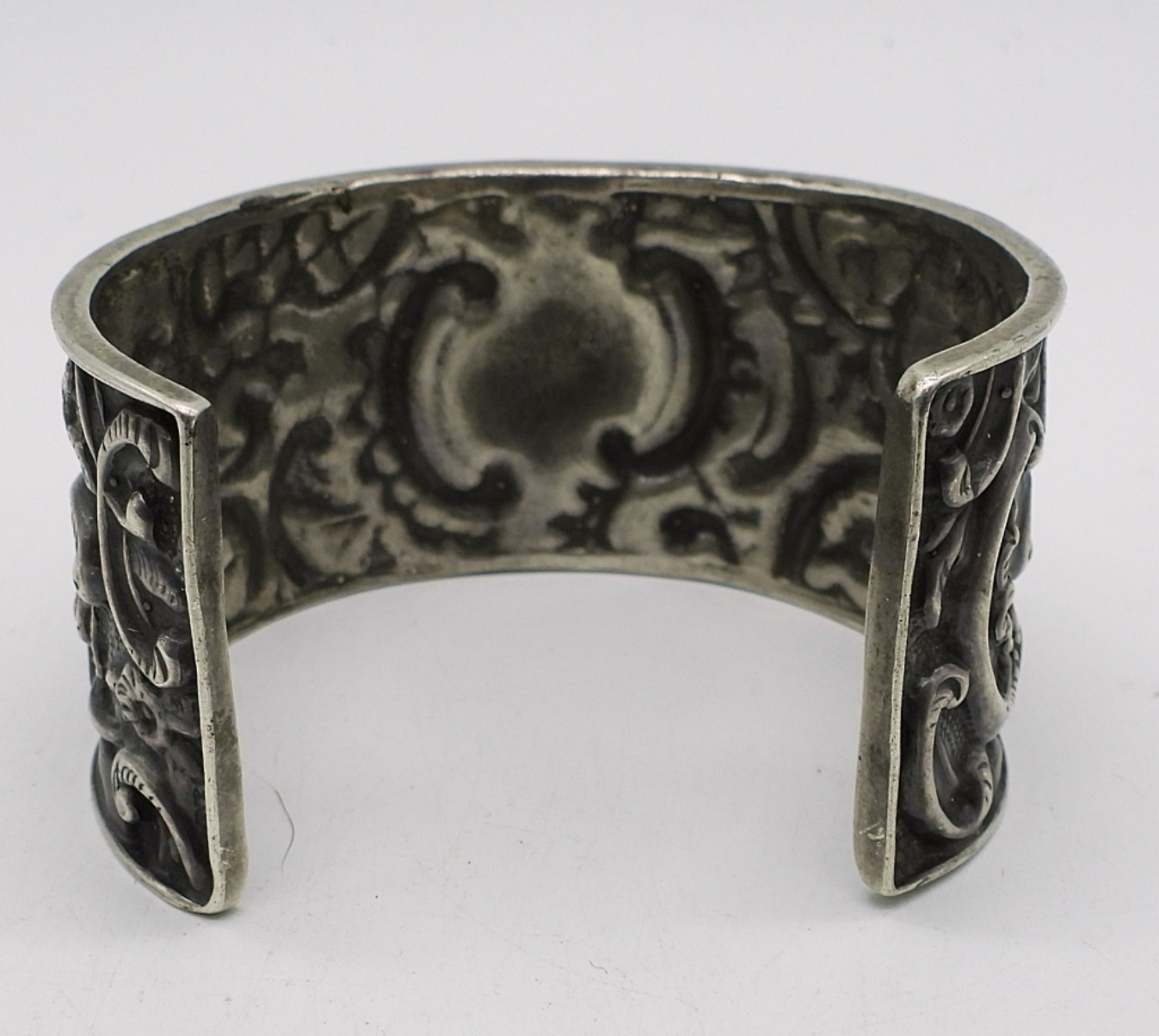 VERY DETAILED STERLING SILVER CUFF BRACELET, 1 1/4″ WIDE. 7″ AROUND. TESTED AS STERLING! 42.8 DWT