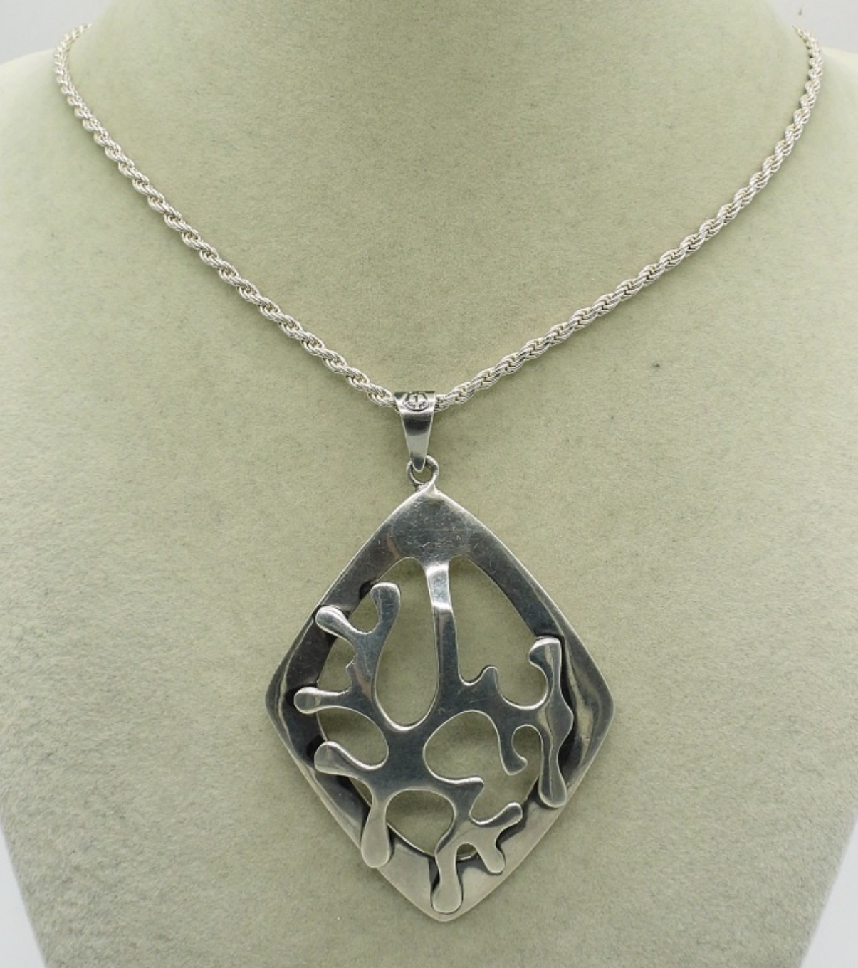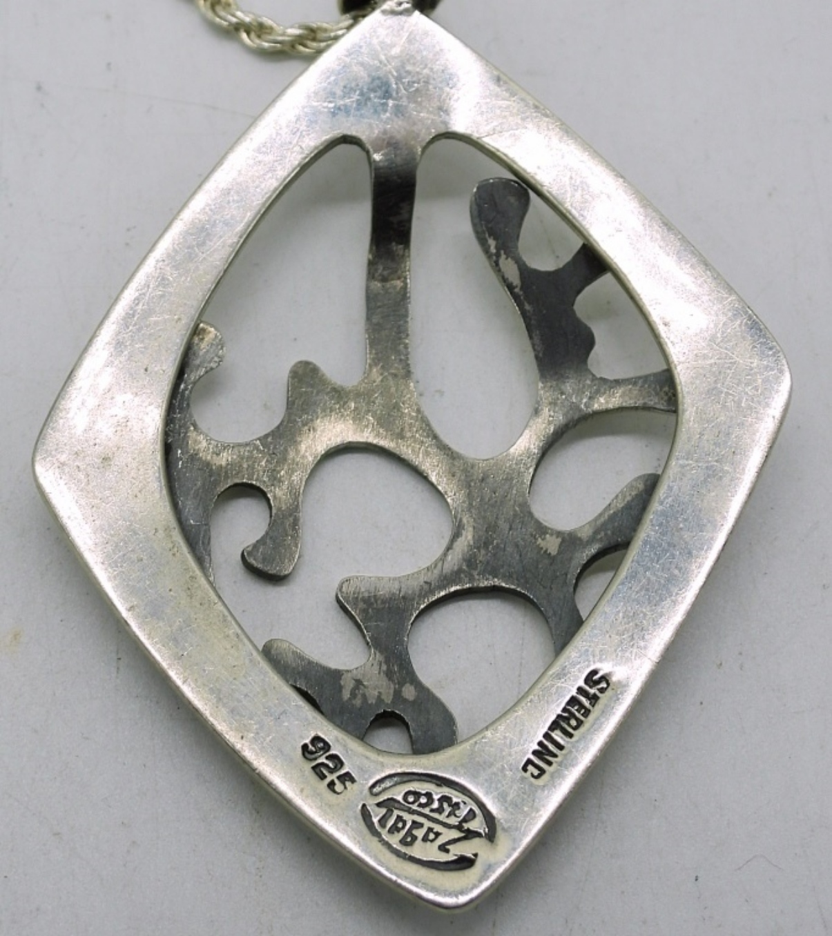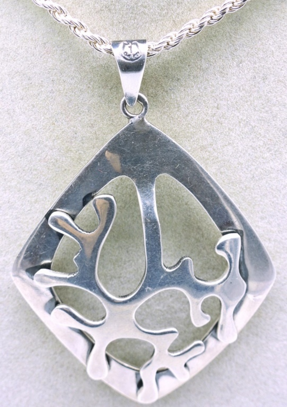 STERLING MEXICO PENDANT, DESIGNED BY JOSEFINA ZAGAL. SIGNED & MARKED 925 STERLING & MAKERS MARK. PENDANT IS 3″ LONG, 2″ WIDE. CHAIN IS 20″. 17.4 DWT