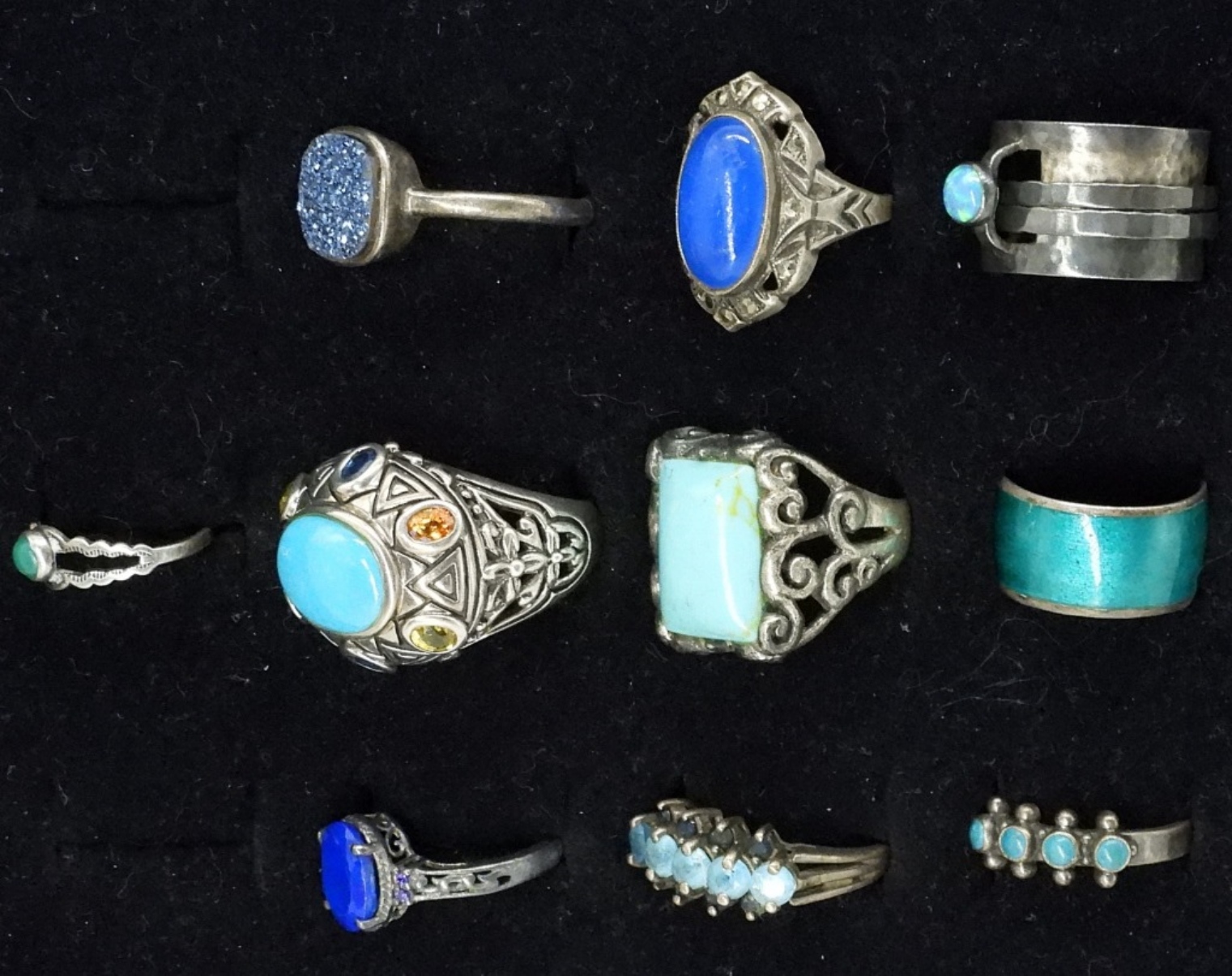 TEN STERLING SILVER FASHION RINGS WITH BLUE GEMSTONES. SIZES 4-10. SOME ARE TARNISHED! 33.8 DWT