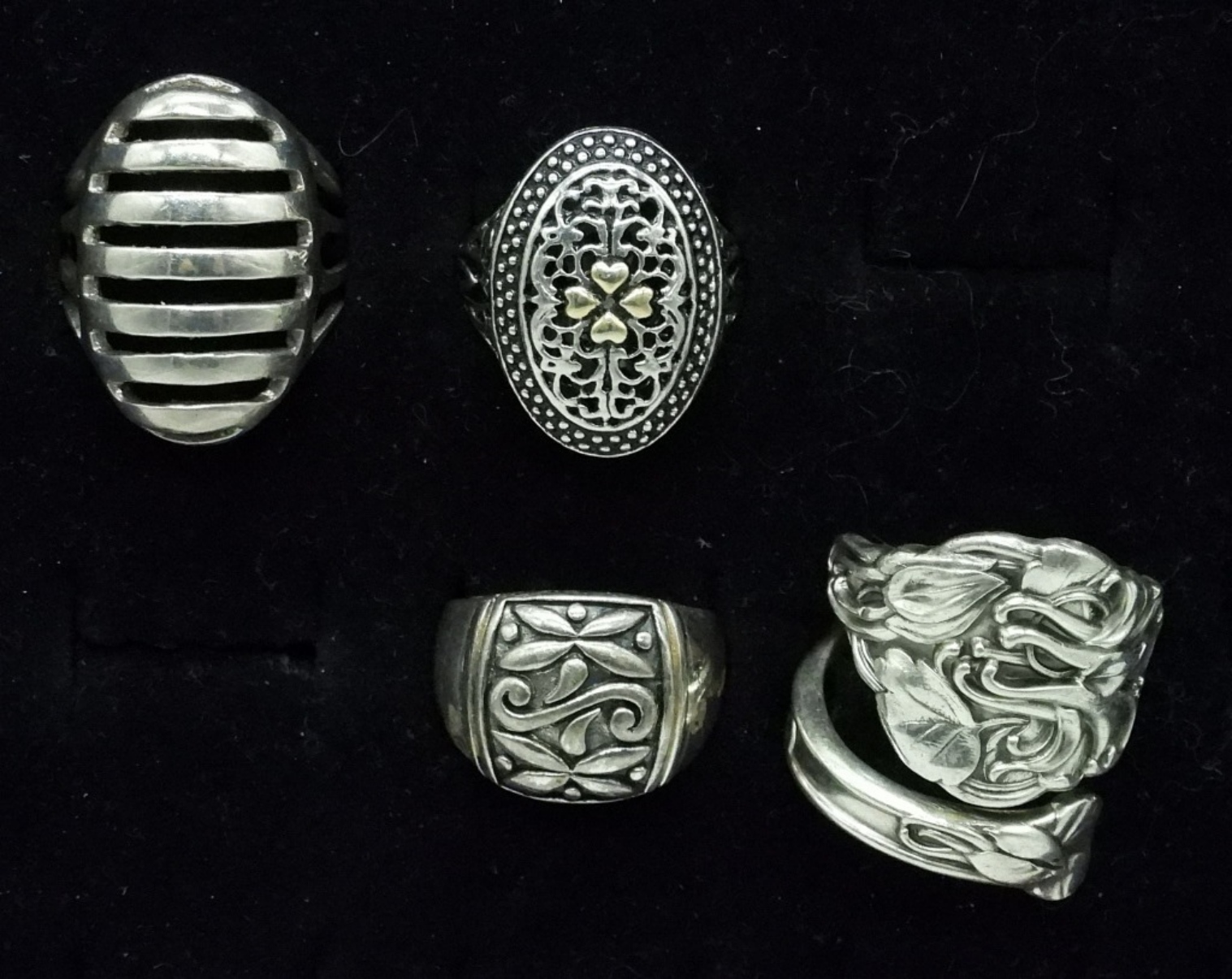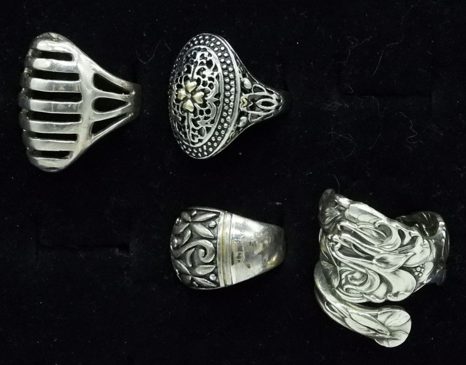 FOUR DECORATIVE STERLING RINGS, SIZES 7, 8, 9. 28.5 DWT