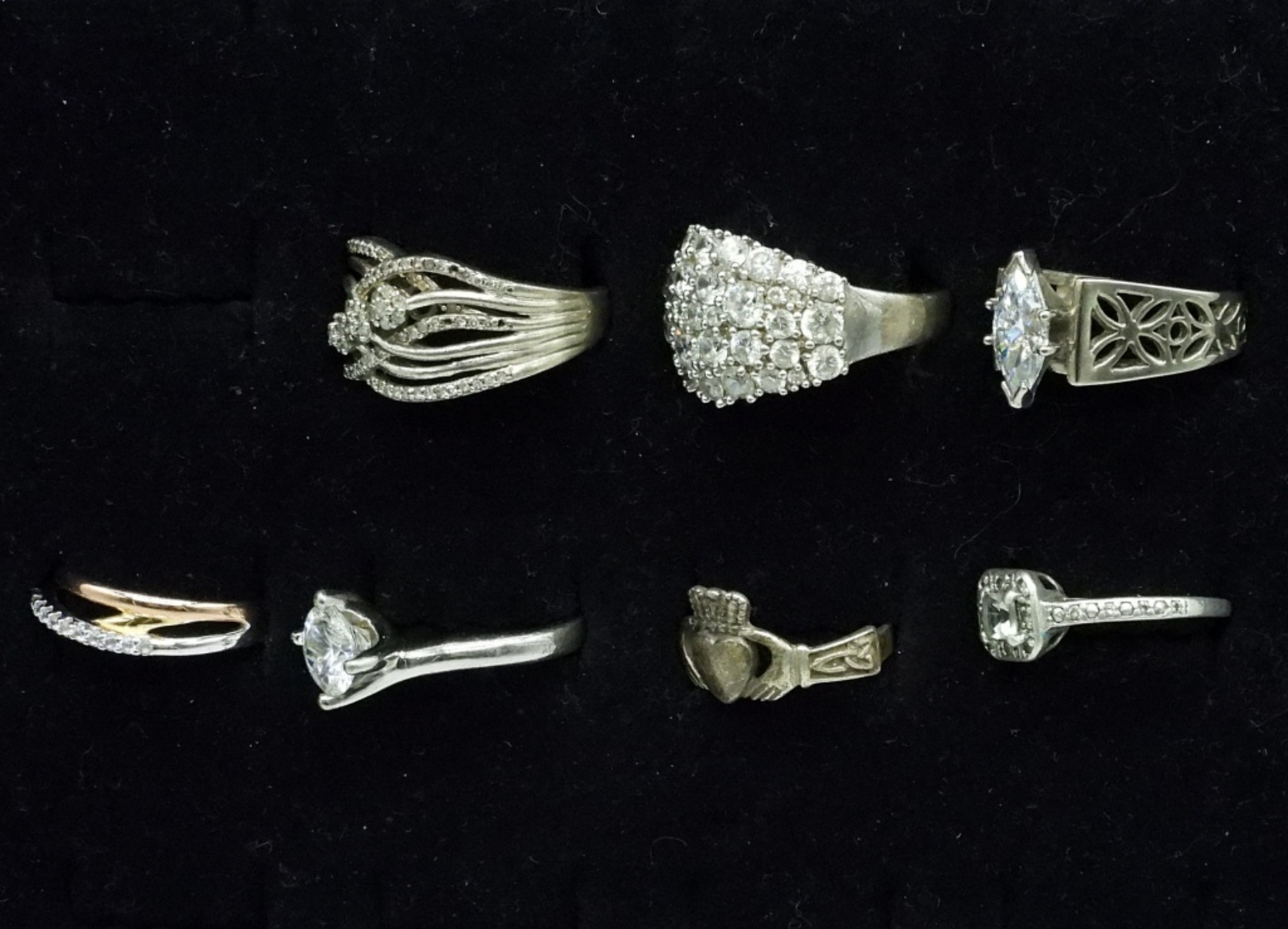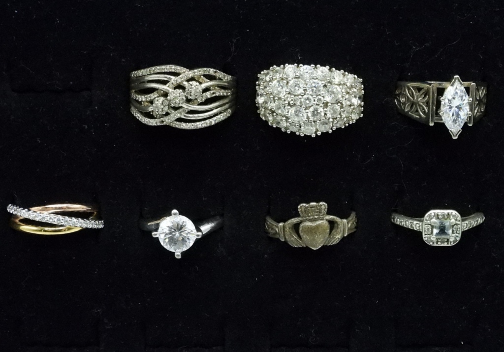 SEVEN STERLING SILVER FASHION RINGS WITH CLEAR GEMSTONES. SIZES 7-10. 21.2 DWT