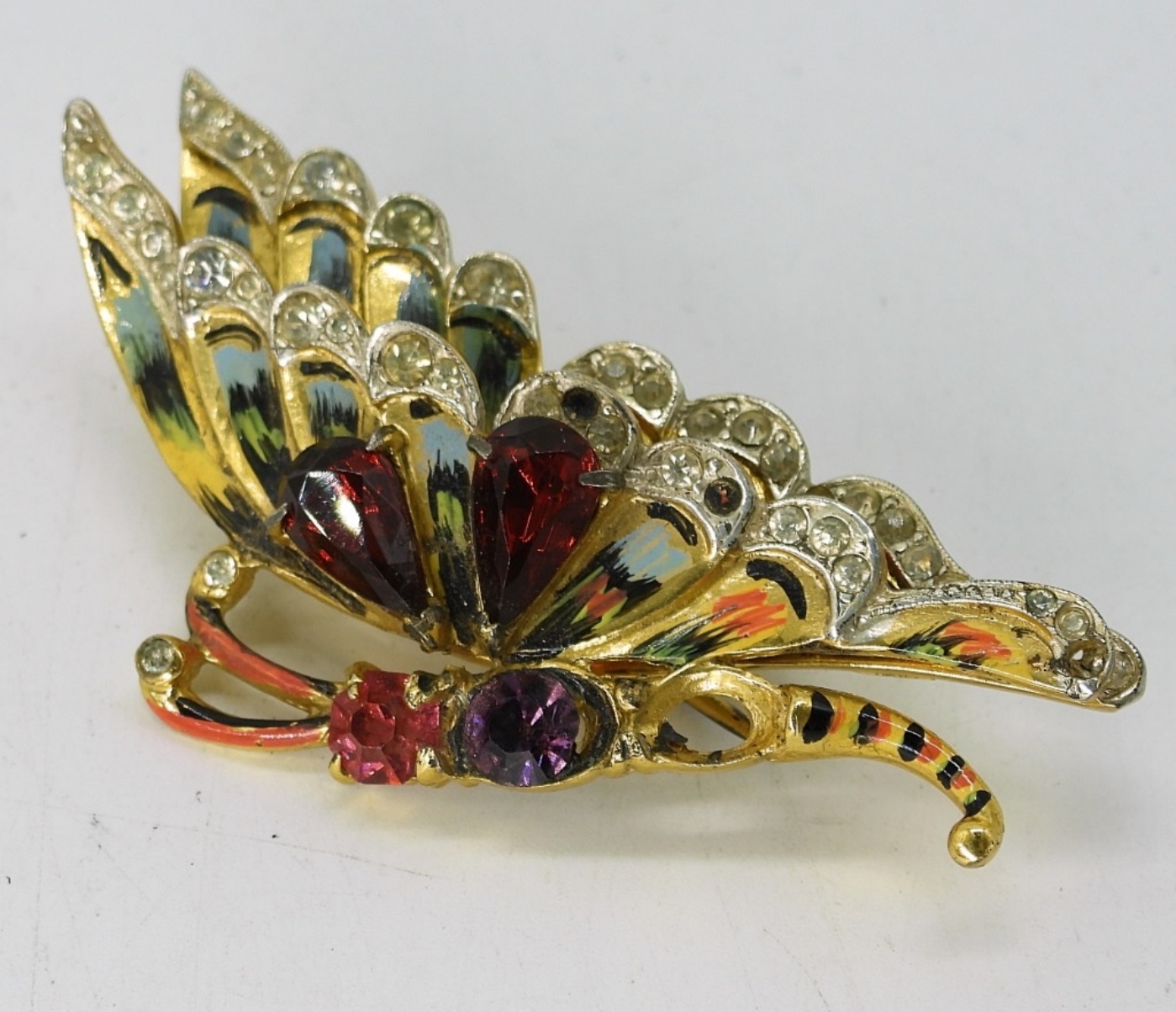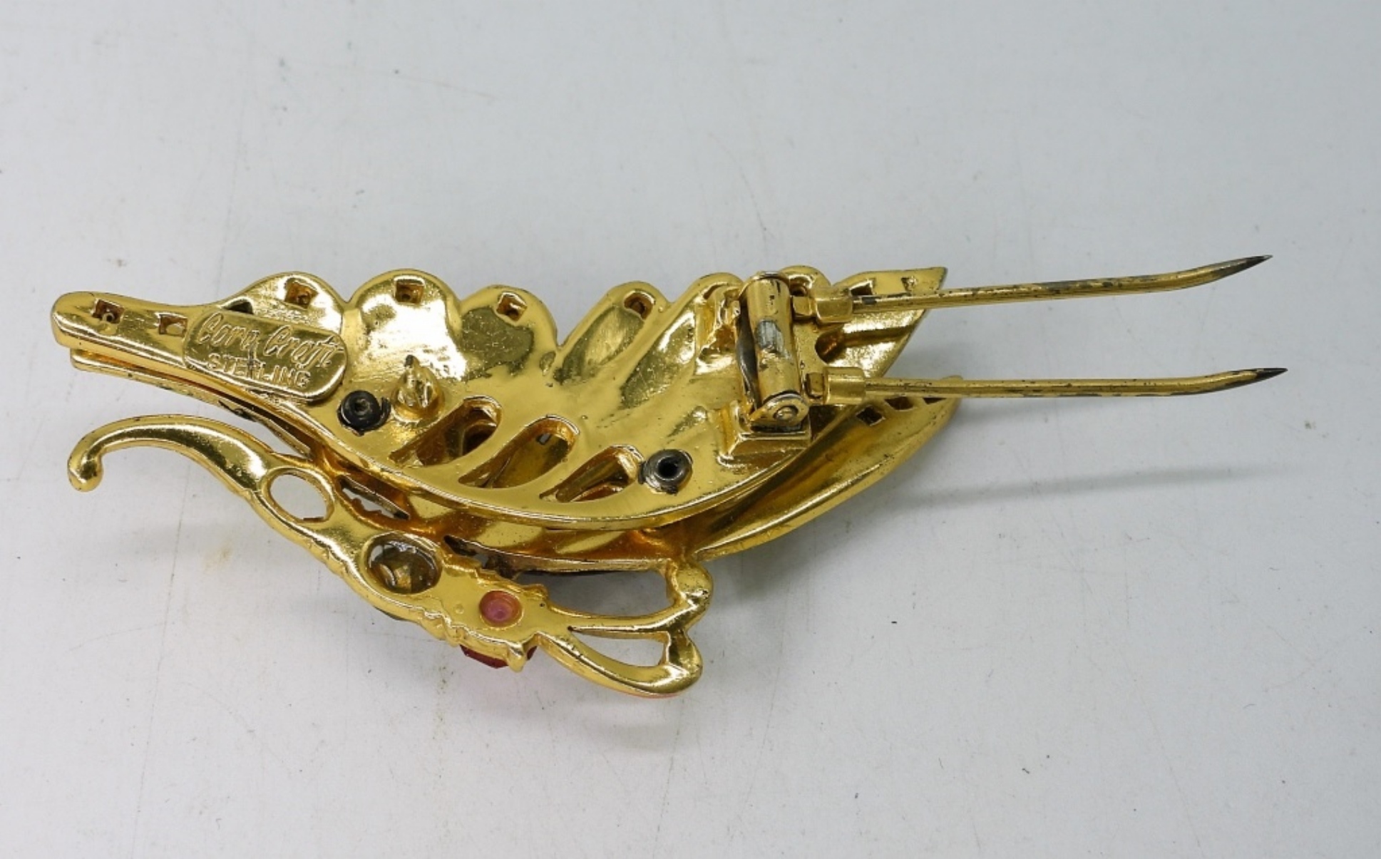 GOLD TONE, CORO CRAFT STERLING. BUTTERFLY GEMSTONE CLIP. MISSING 3 GEMSTONES. 2.5″ LONG. 14.5 DWT