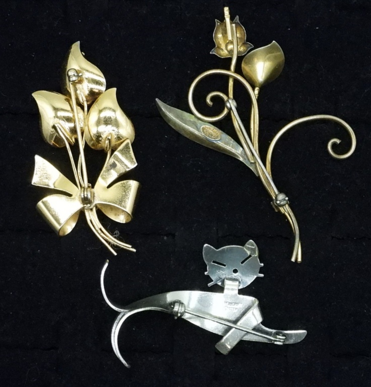VAN DELL STERLING WITH GOLD OVERLAY FLORAL PIN, 4.5″. CORO STERLING GOLD TONE RHINESTONE PIN, 2″. BEAUCRAFT STERLING CAT PIN, 2″. 11.9 DWT