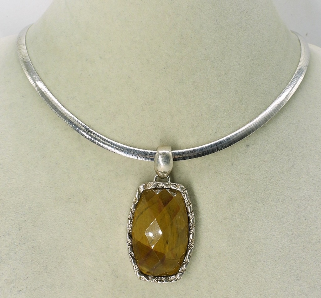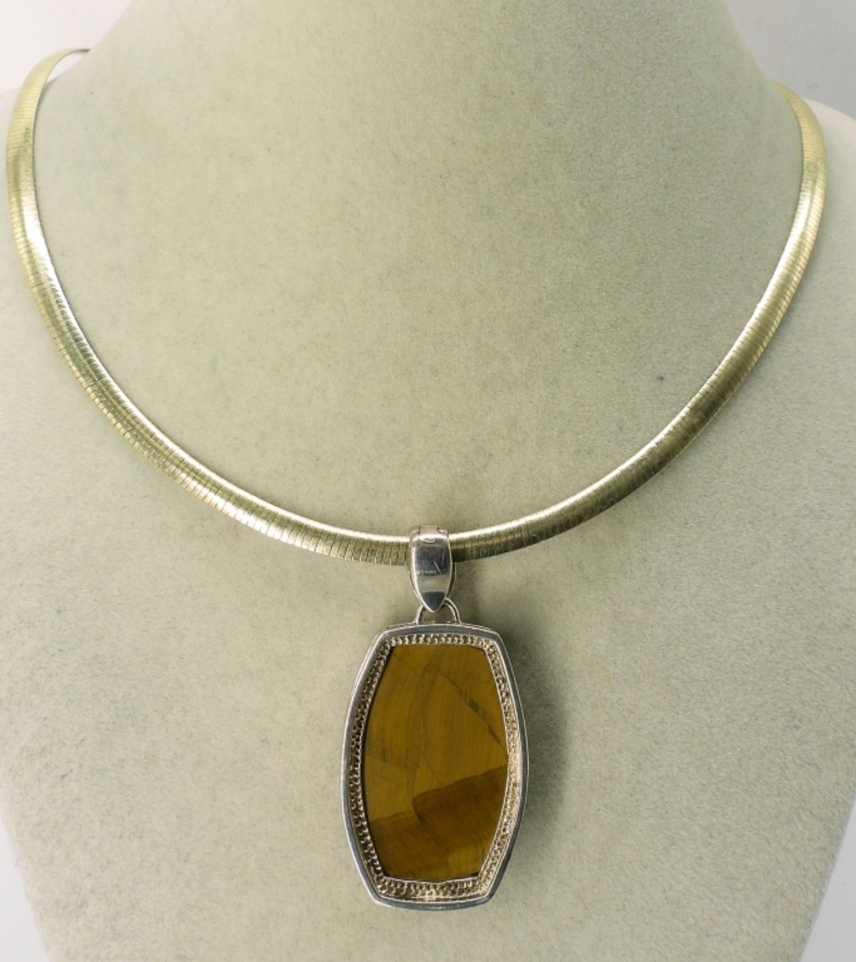 LARGE STERLING TIGERS EYE PENDANT ON A REVERSIBLE TWO TONE 17.5″ STERLING CHAIN. 18.2 DWT