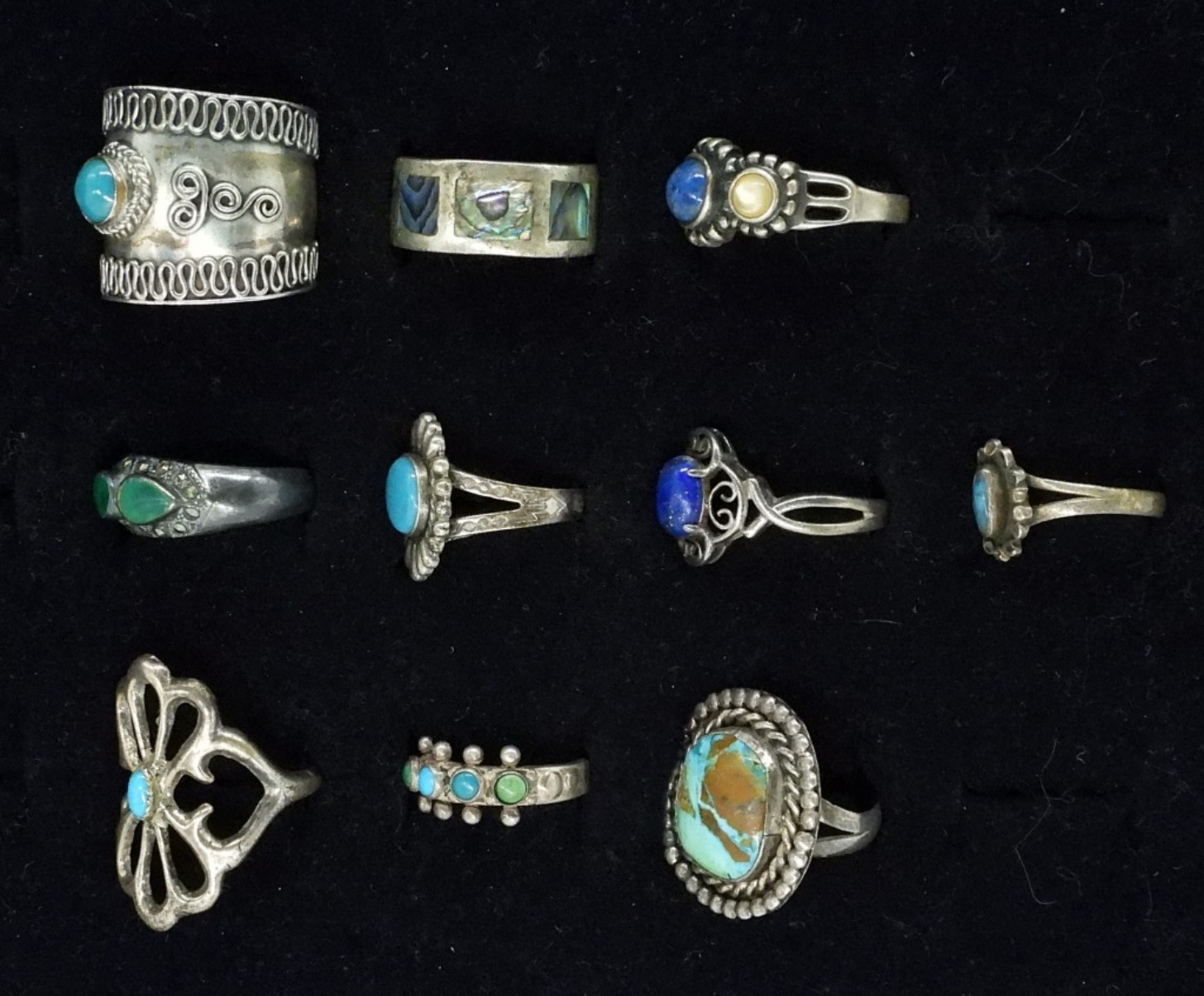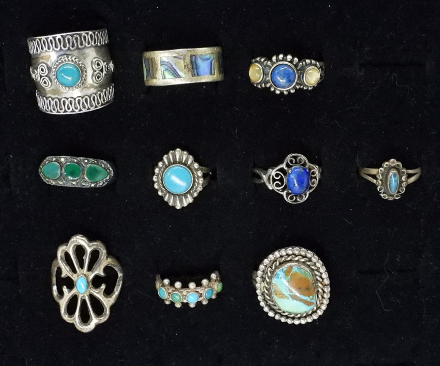 TEN BLUE GEMSTONE STERLING FASHION RINGS, SIZES 3.5-8 27 DWT