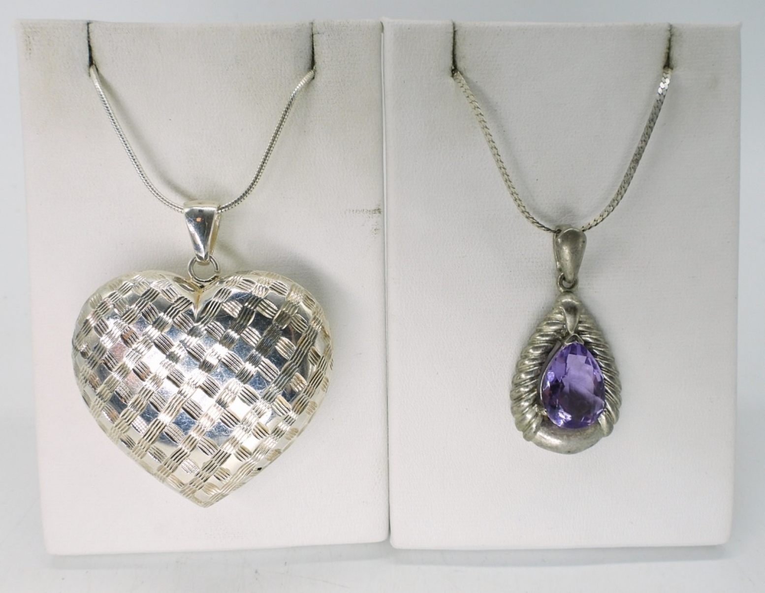 STERLING HEART PENDANT & AMETHYST PENDANT. NECKLACES ARE 15″, 20″, 28″. 32 DWT