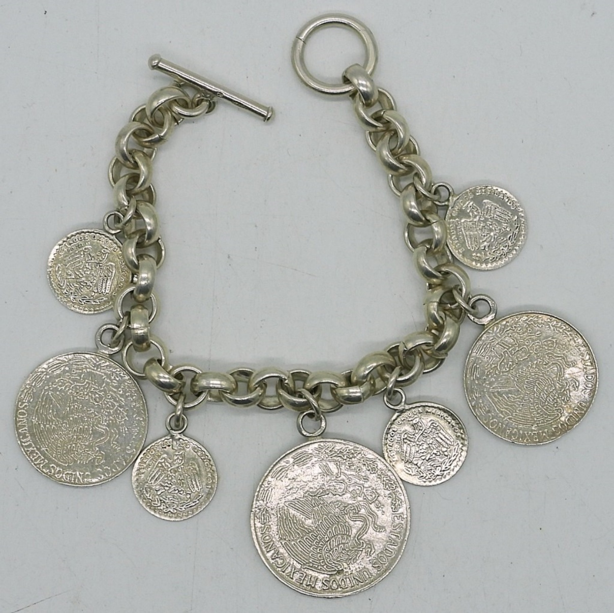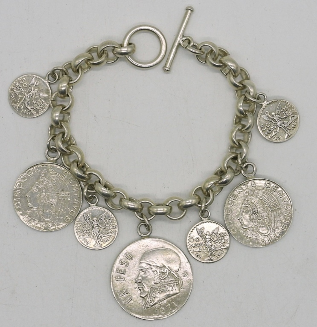 MEXICAN COIN BRACELET, MARKED “MEXICO 925″. 7”. 28 DWT