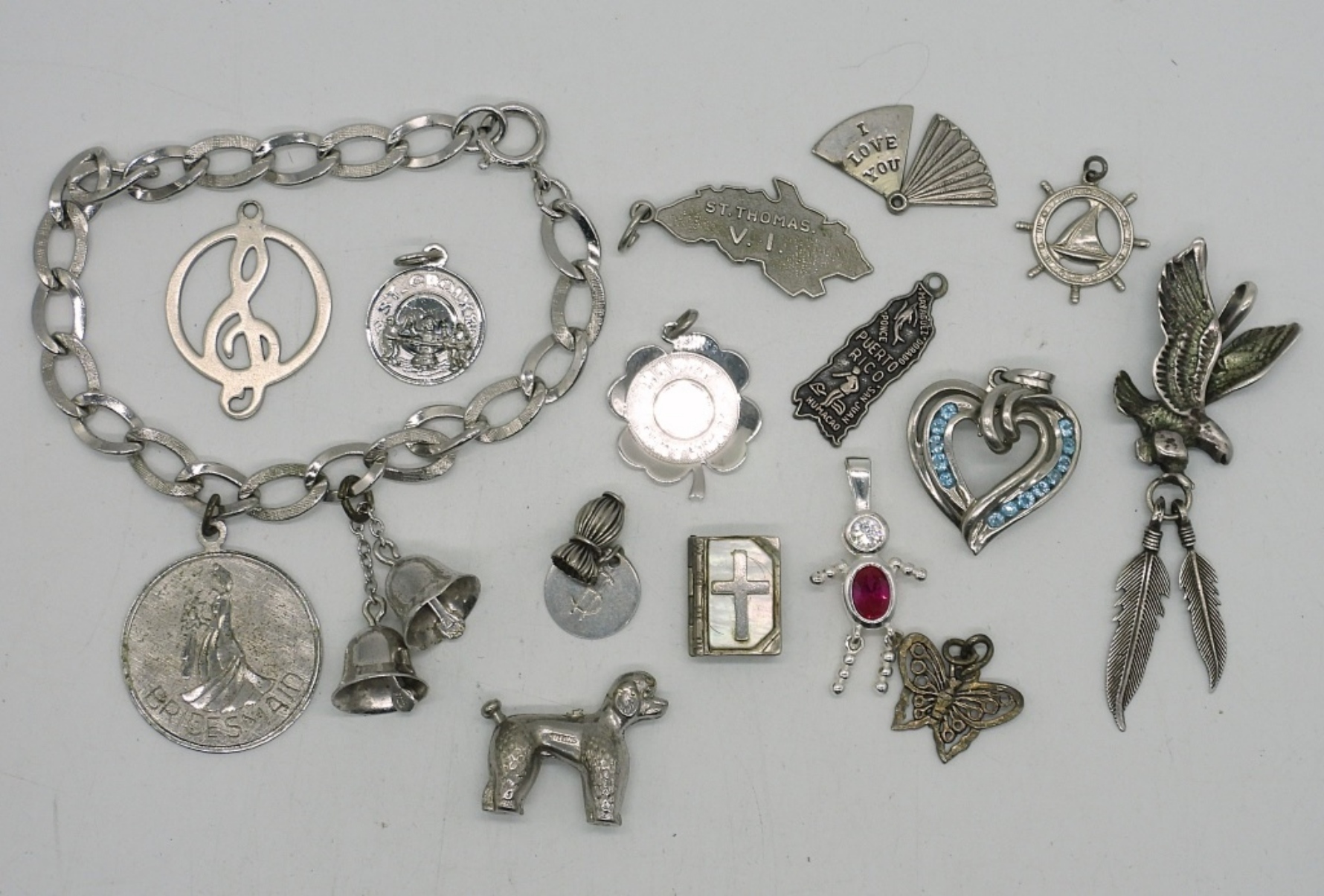 STERLING SILVER VINTAGE CHARM BRACELET WITH 17 STERLING CHARMS. 28.3 DWT