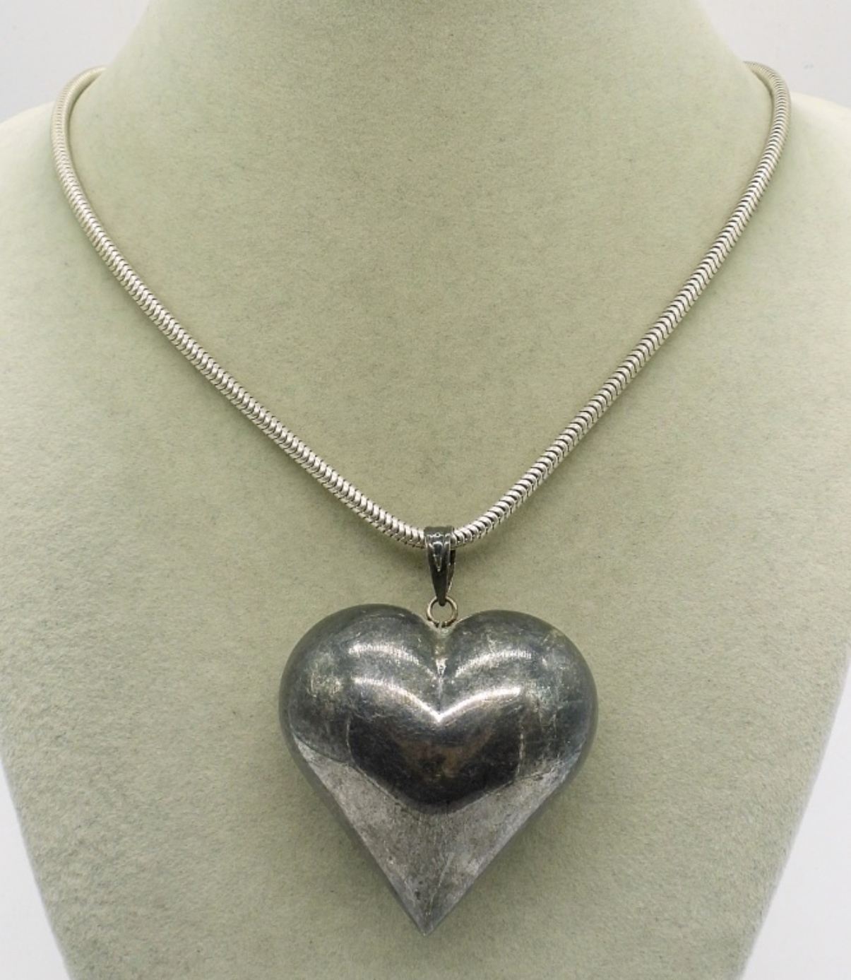 LARGE STERLING HEART PENDANT (TARNISHED) AND THICK STERLING CHAIN. HEART IS 2.5″. CHAIN IS 17″. 22.6 DWT