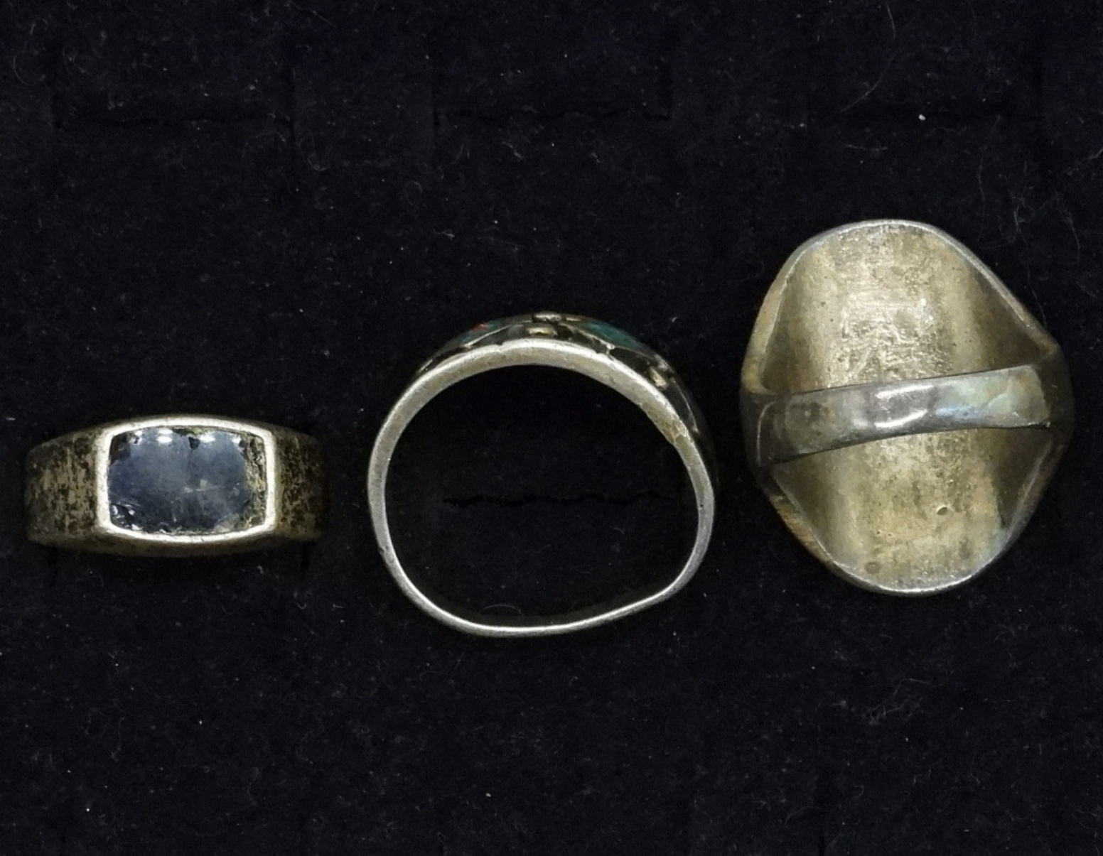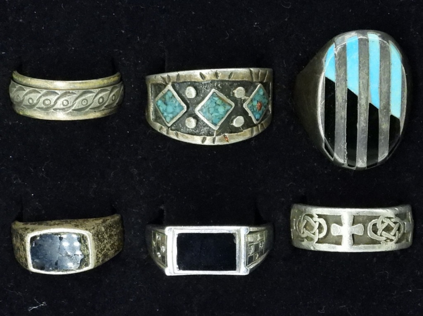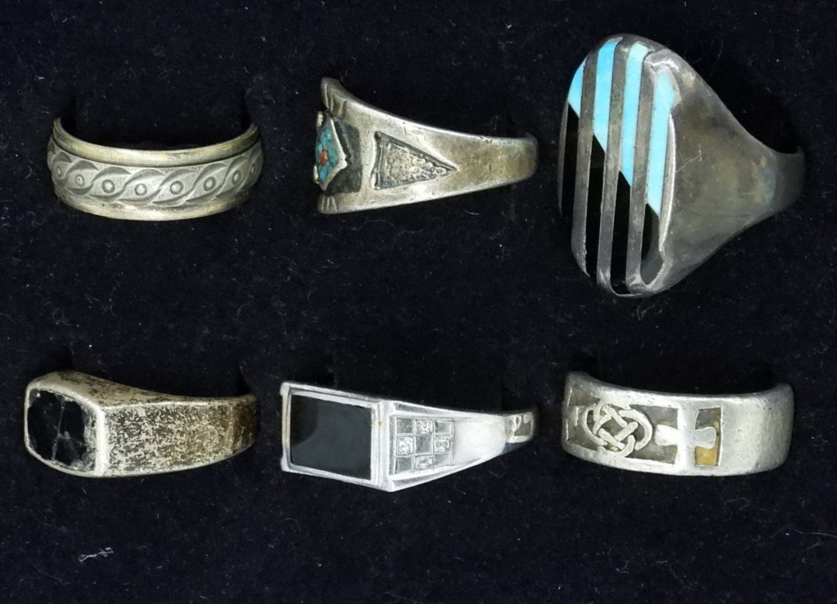 SIX STERLING MEN’S RINGS, SOME TARNISH & MISSHAPEN BANDS. SIZES 9-14. 40.8 DWT