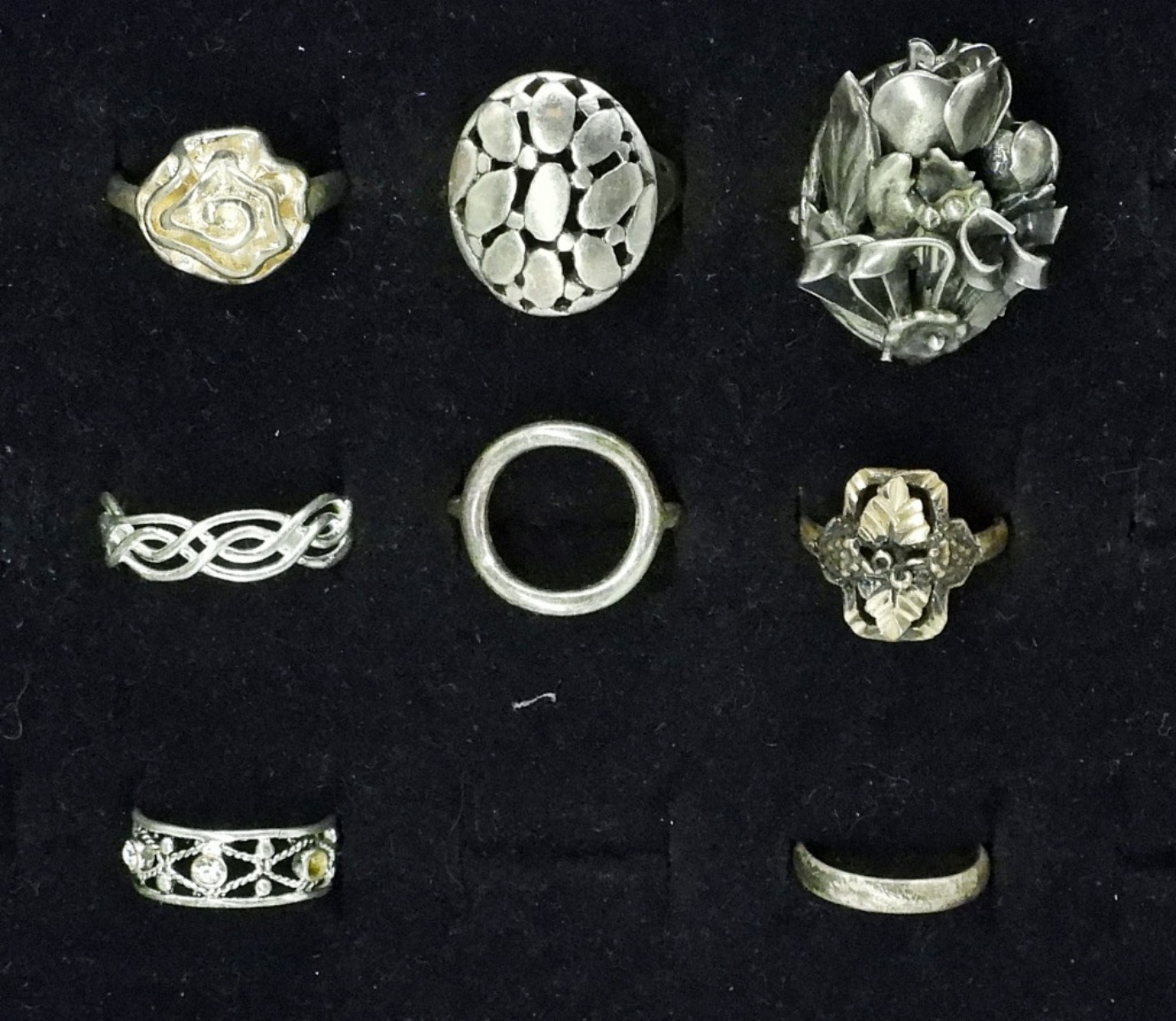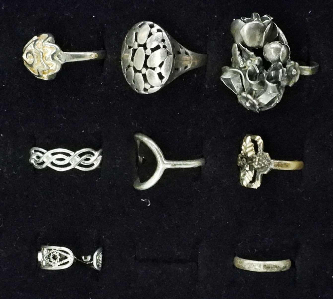EIGHT STERLING VINTAGE FASHION RINGS, SOME TARNISHED. SIZES 3.5-7. 18.8 DWT