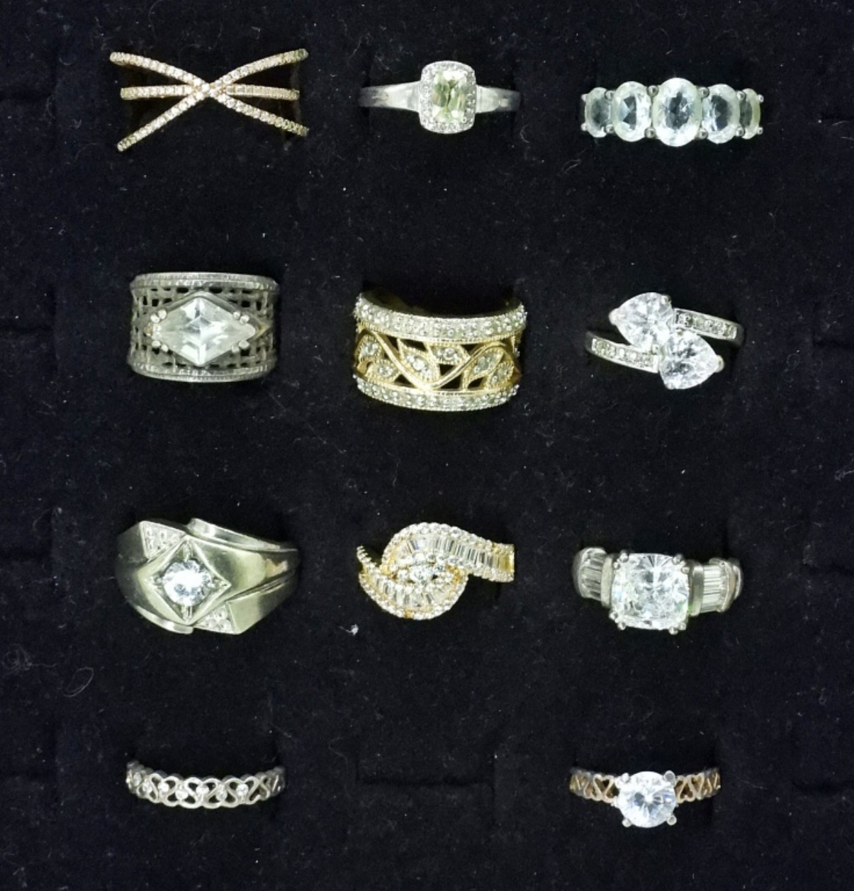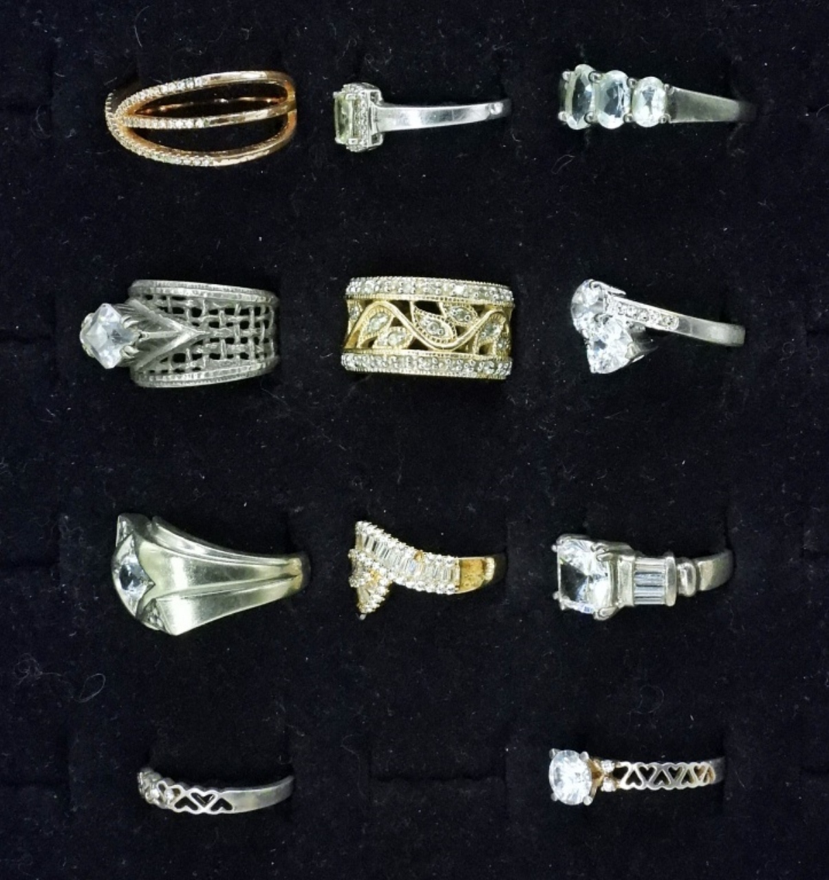ELEVEN STERLING BRIDAL STYLE FASHION RINGS, SOME TARNISH (ONE BAND MISSHAPEN). SILVER, GOLD, ROSE GOLD TONES. SIZES 6-10. 33.2 DWT