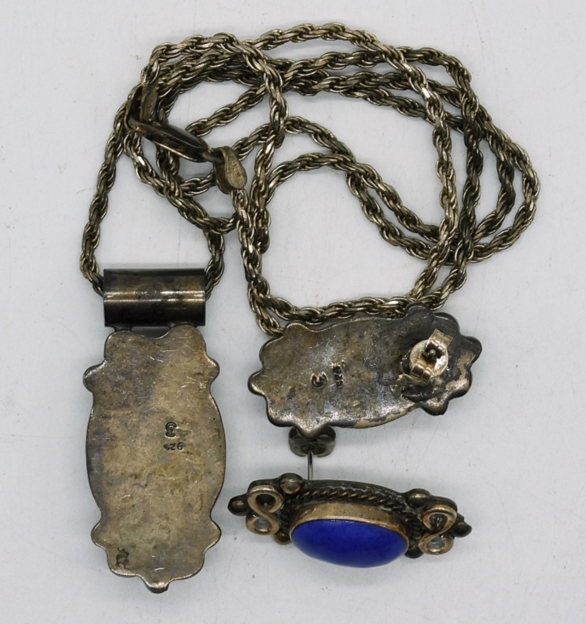 VERY TARNISHED, BLUE GEMSTONE STERLING SET. CHAIN IS 23″. PENDANT IS 1.5″. EARRINGS 1.5″ PIERCED. 24.2 DWT