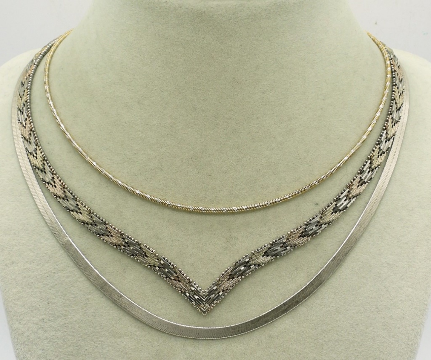 TRI TONE STERLING V NECKLACE, 16″. OTHER TWO CHAINS ARE 17.5″. 27.2 DWT