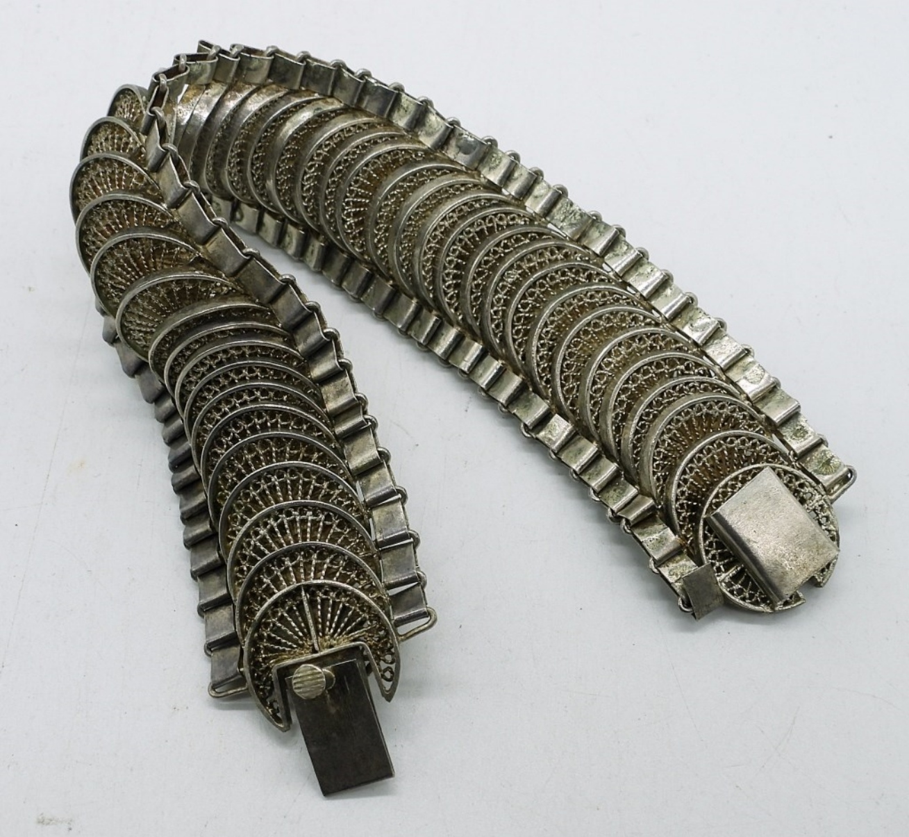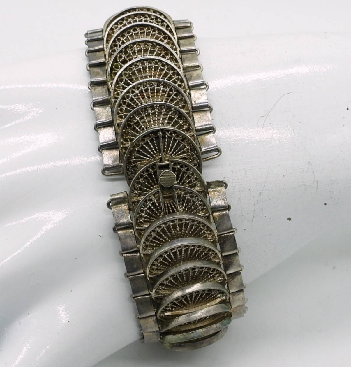 VERY UNIQUE STERLING (NOT MARKED, TESTED AS STERLING) BRACELET. 8″. 36.9 DWT