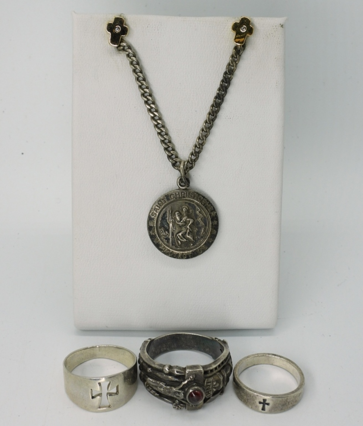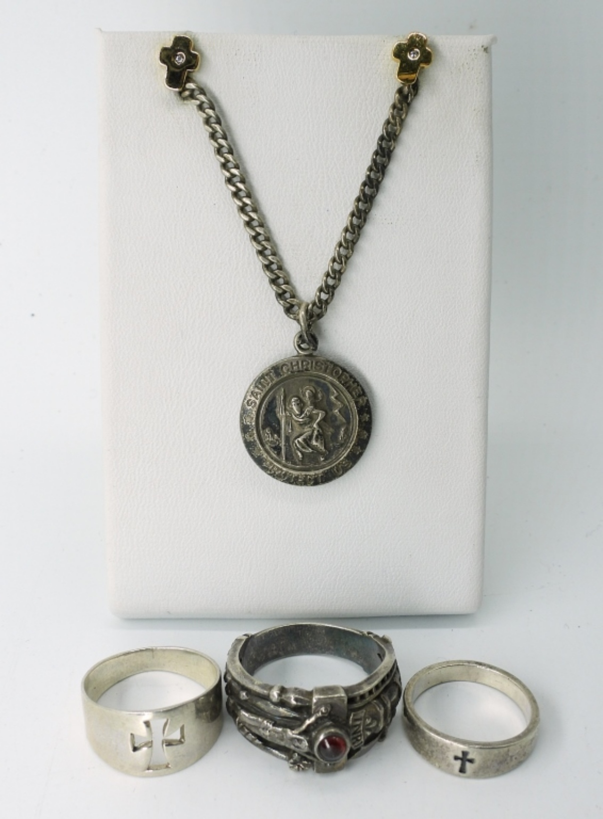 ALL MARKED STERLING OR 925. 3 RINGS, SIZES 6, 8, 10. MEDALLION NECKLACE, 26″. GOLD TONE CROSS EARRINGS. 25 DWT