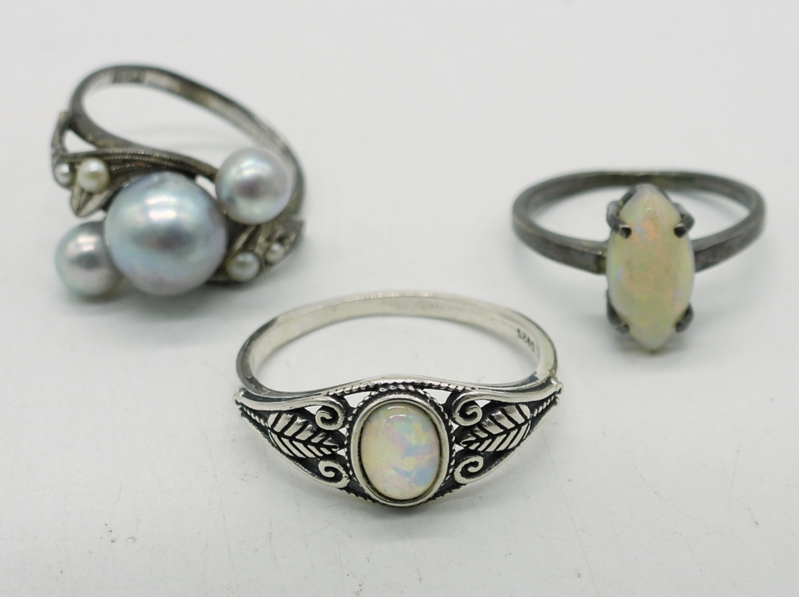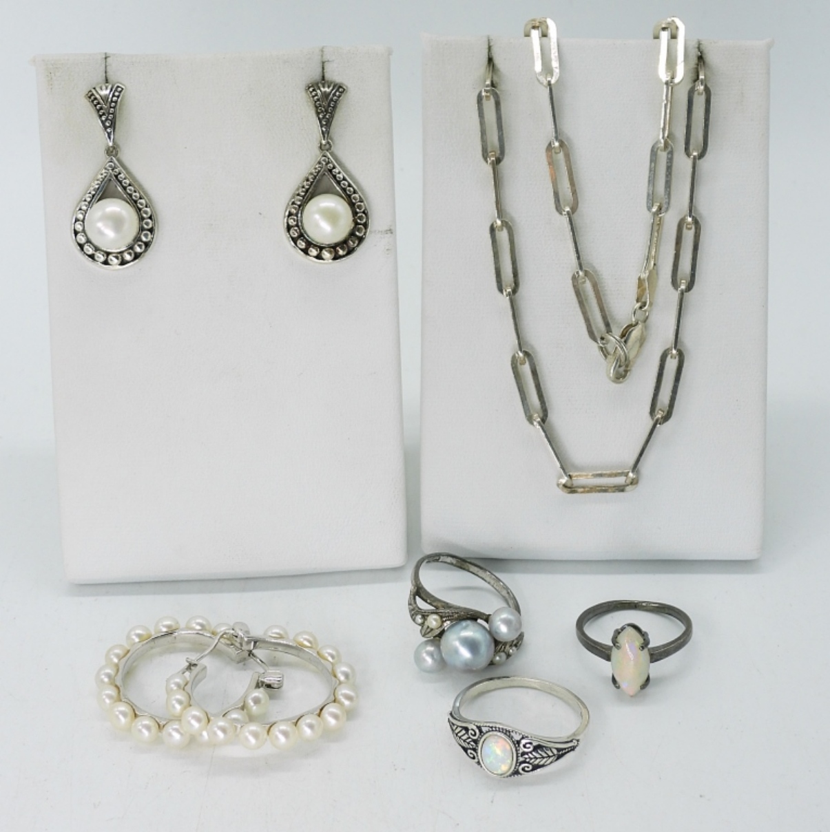 3 RINGS, SIZES 5, 6, 8.5. TWO PAIR OF EARRINGS, PIERCED. STERLING CHAIN NECKLACE 21″. 22.2 DWT
