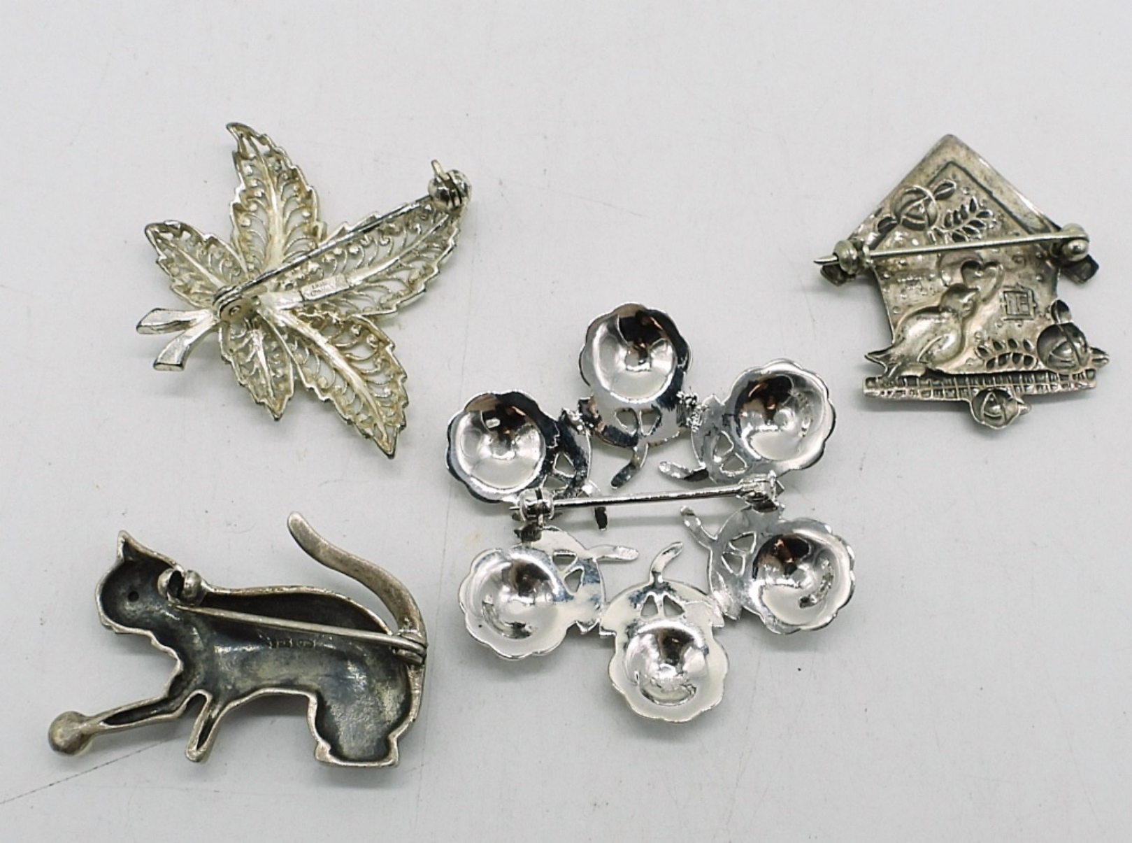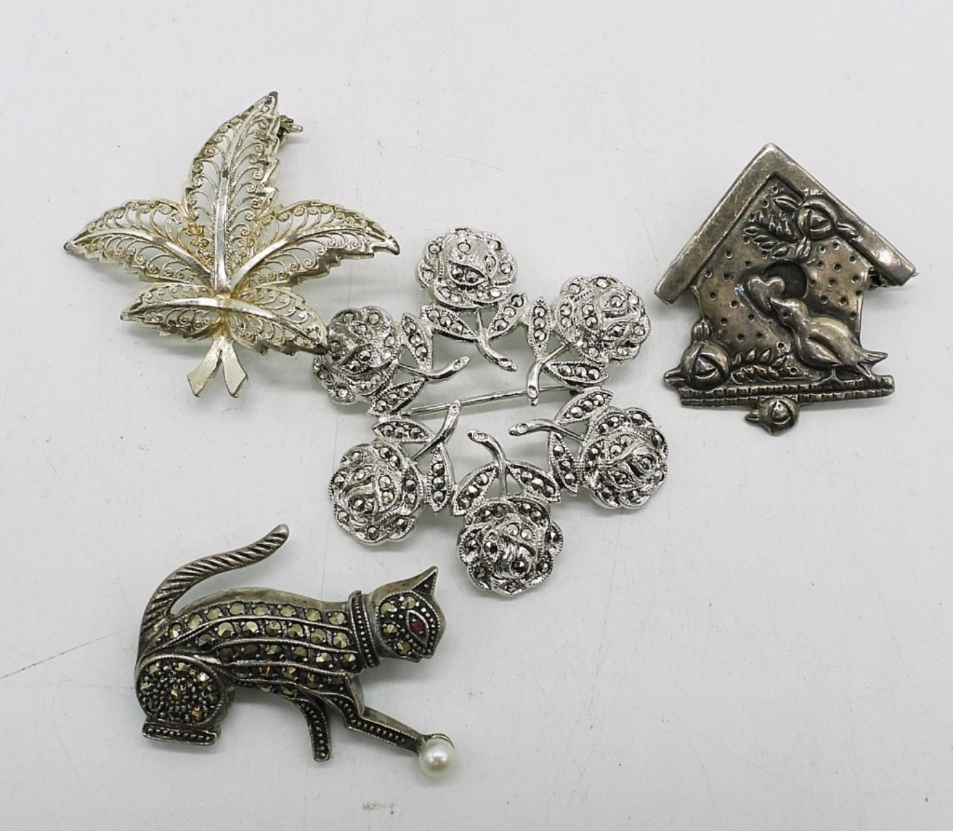 FOUR STERLING VINTAGE BROOCHES, MARCASITE. 1-1.5″. 20.7 DWT