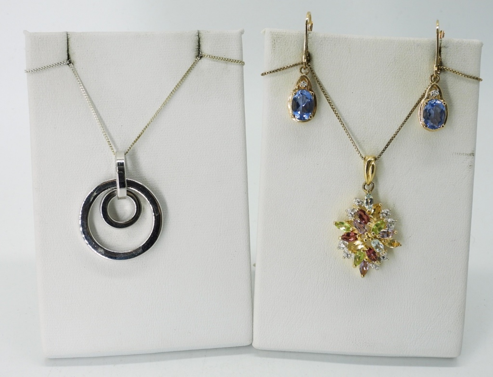 STERLING GOLD TONE AND SILVER TONE. NECKLACES ARE 16 & 18″. TANZANITE COLORED GEMSTONE EARRINGS IN GOLD TONE, PIERCED. 8.5 DWT