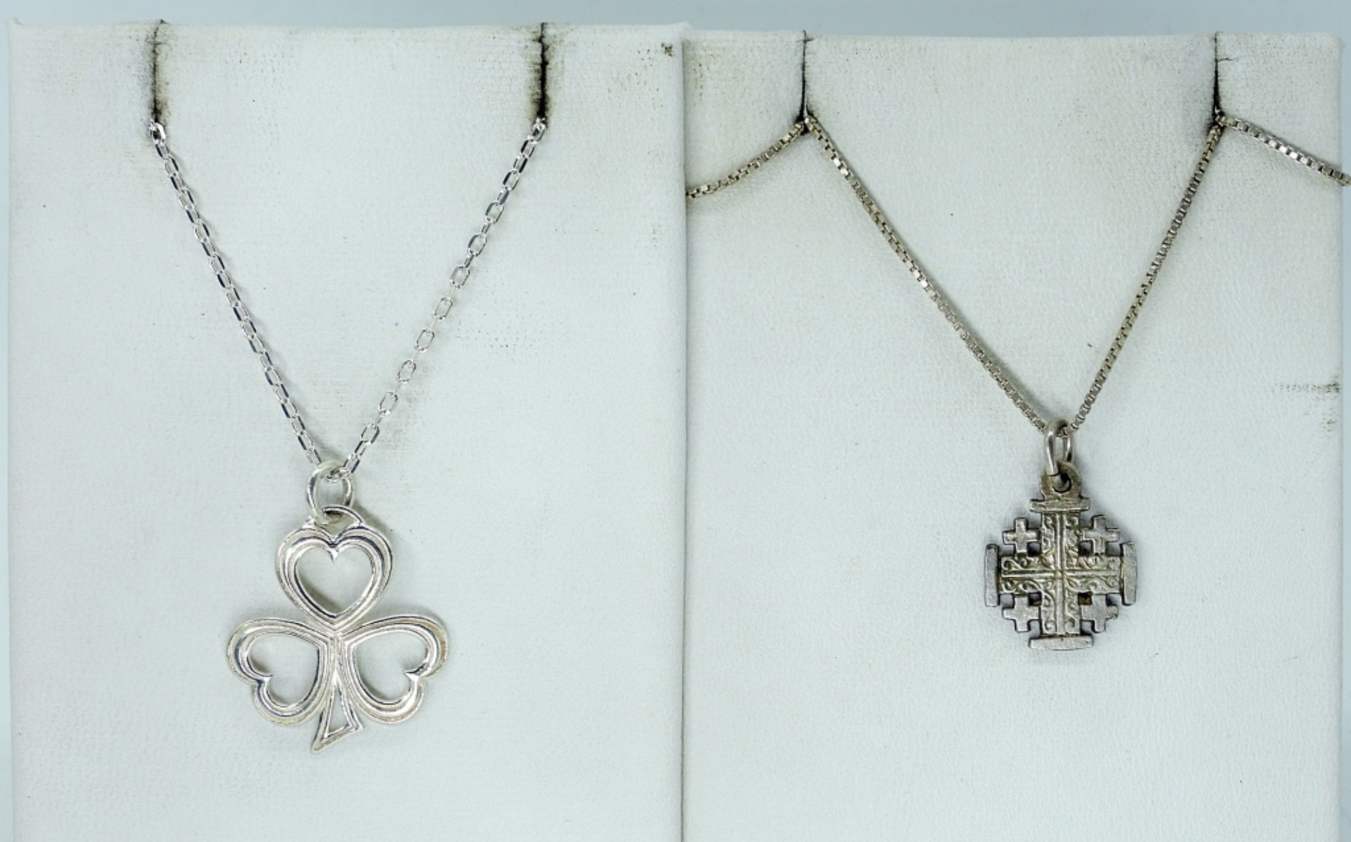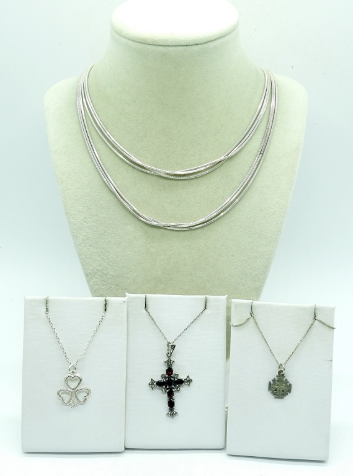 FOUR STERLING NECKLACES. MULTI STRAND IS 35″. OTHERS ARE 17-18″. 19.9 DWT