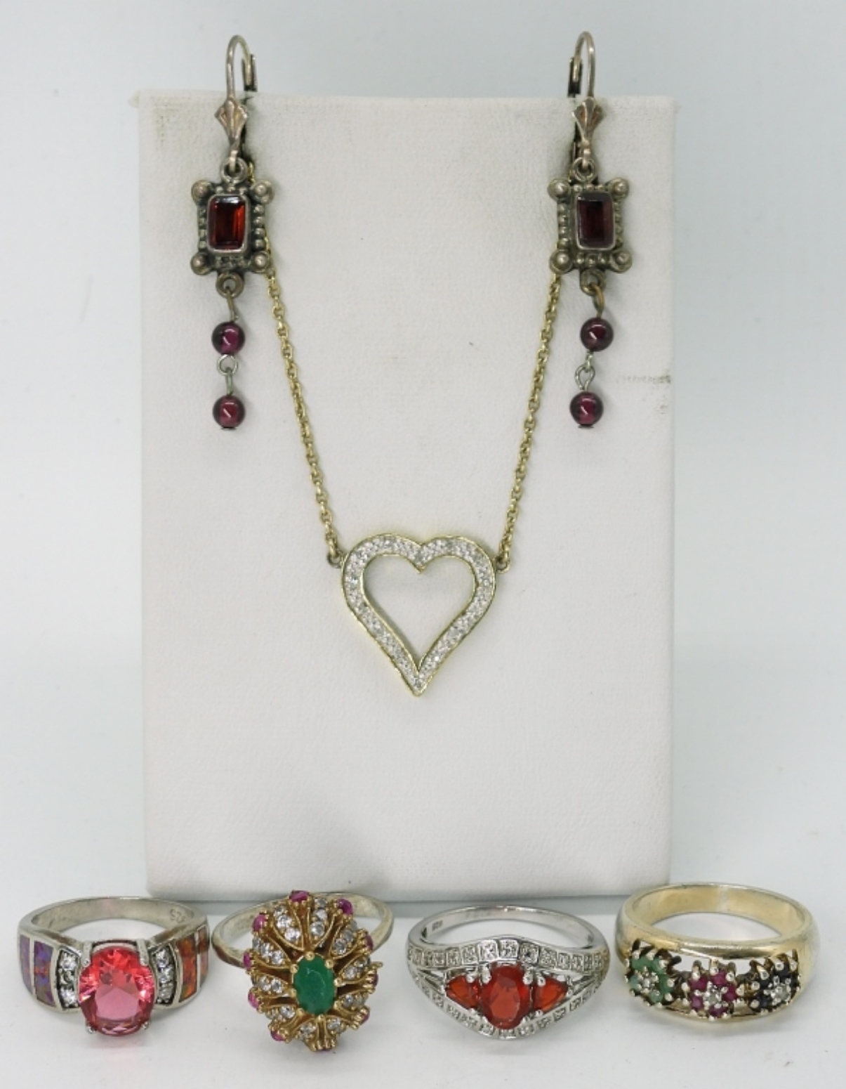 FOUR STERLING RINGS, SIZES 6-8. PIERCED STERLING EARRINGS, 1.5″ LONG. GOLD TONE STERLING HEART NECKLACE 18″. 15.4 DWT