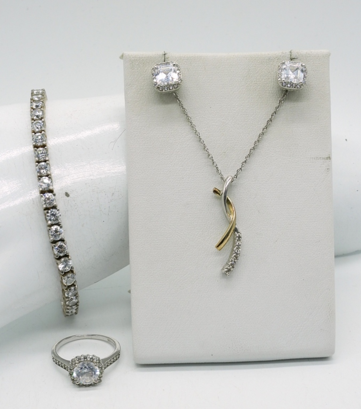ALL STERLING, BRACELET 8″. RING SIZE 7 WITH MATCHING PIERCED EARRINGS. 925/10K NECKLACE 18″. 14.3 DWT