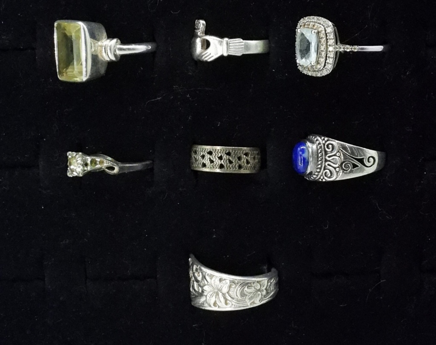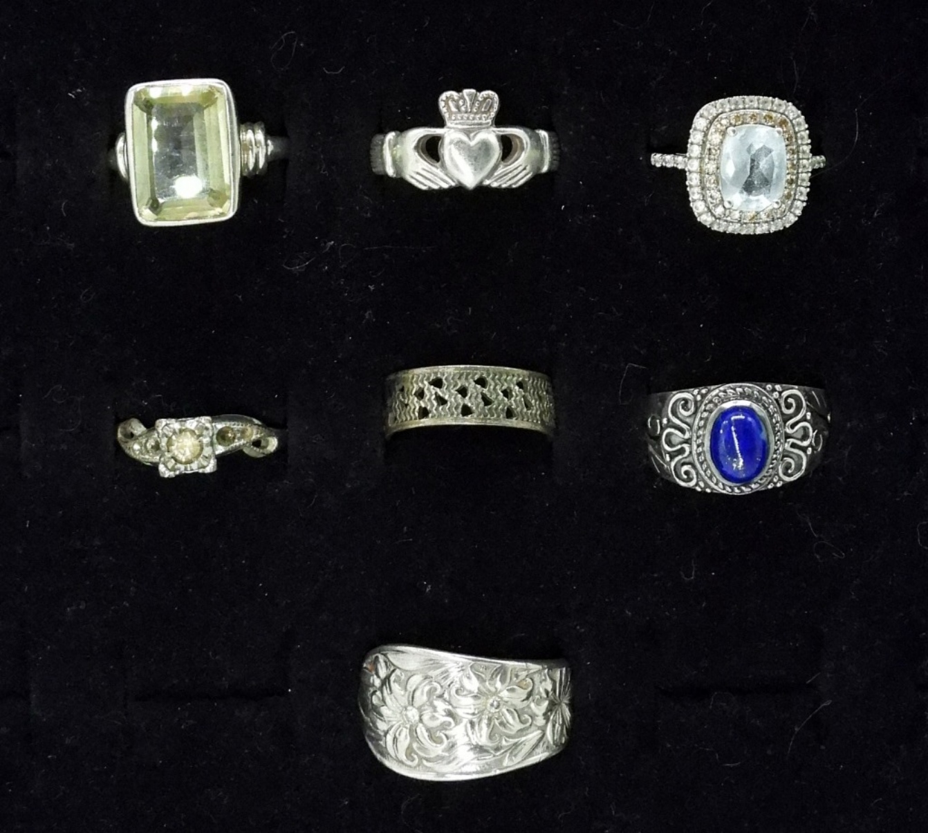 SEVEN LADIES STERLING FASHION GEMSTONE RINGS AND BANDS. SIZES 6-9. 20.2 DWT