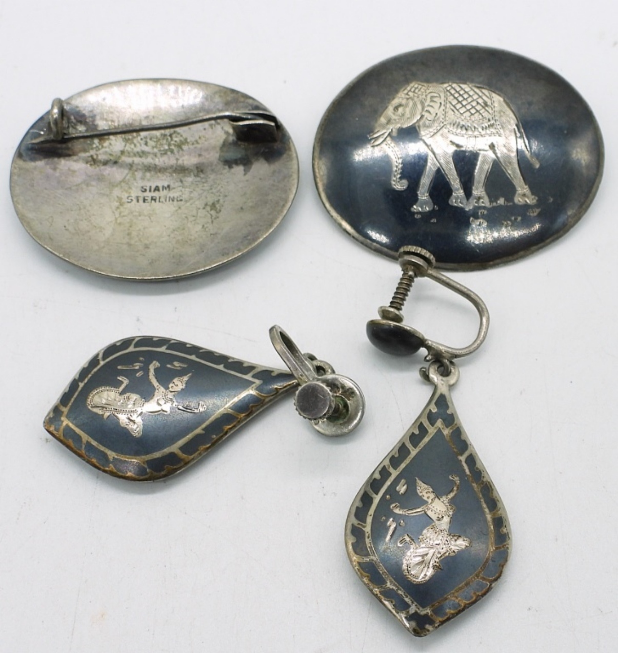 TWO ELEPHANT SIAM STERLING BROOCHES, ONE PAIR OF SCREW BACK SIAM STERLING EARRINGS. VINTAGE!! 17.2 DWT