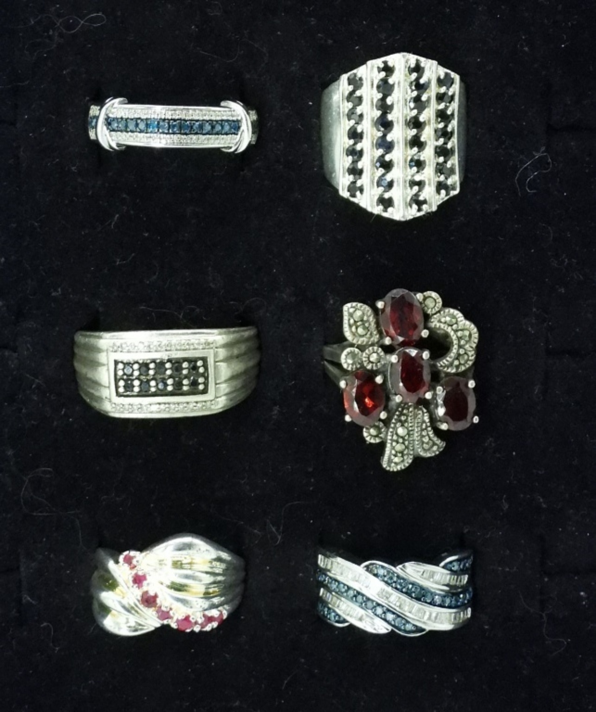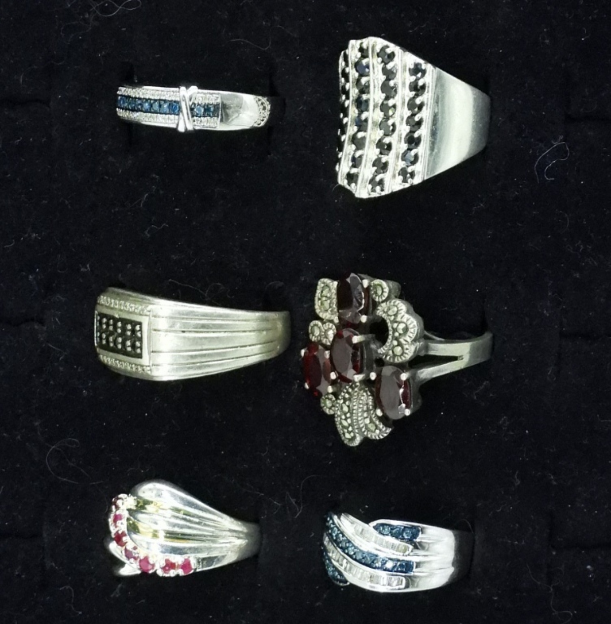 SIX STERLING SILVER RINGS WITH VERY PRETTY, DARK GEMSTONES. SIZES 6-10. 25.3 DWT