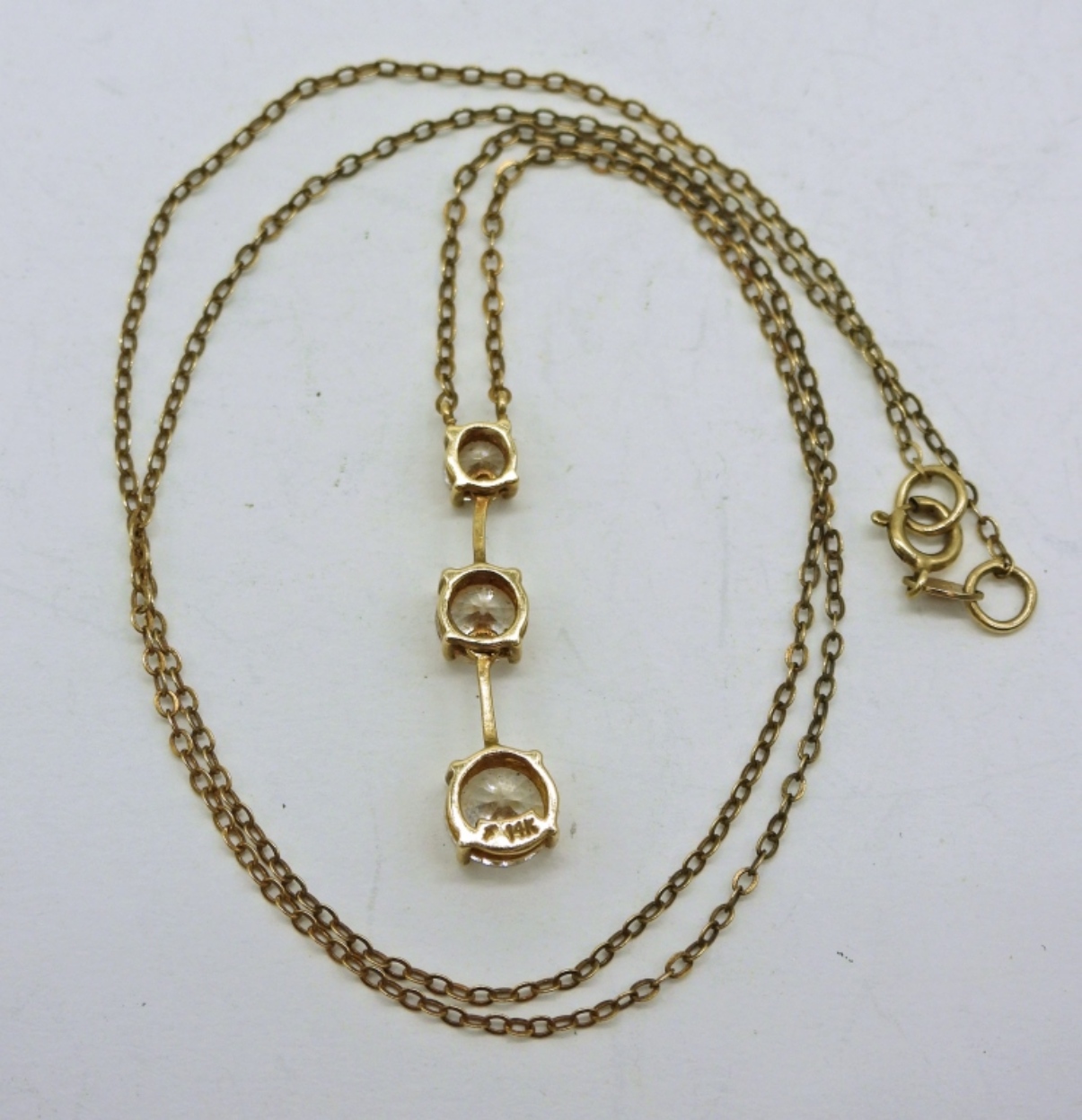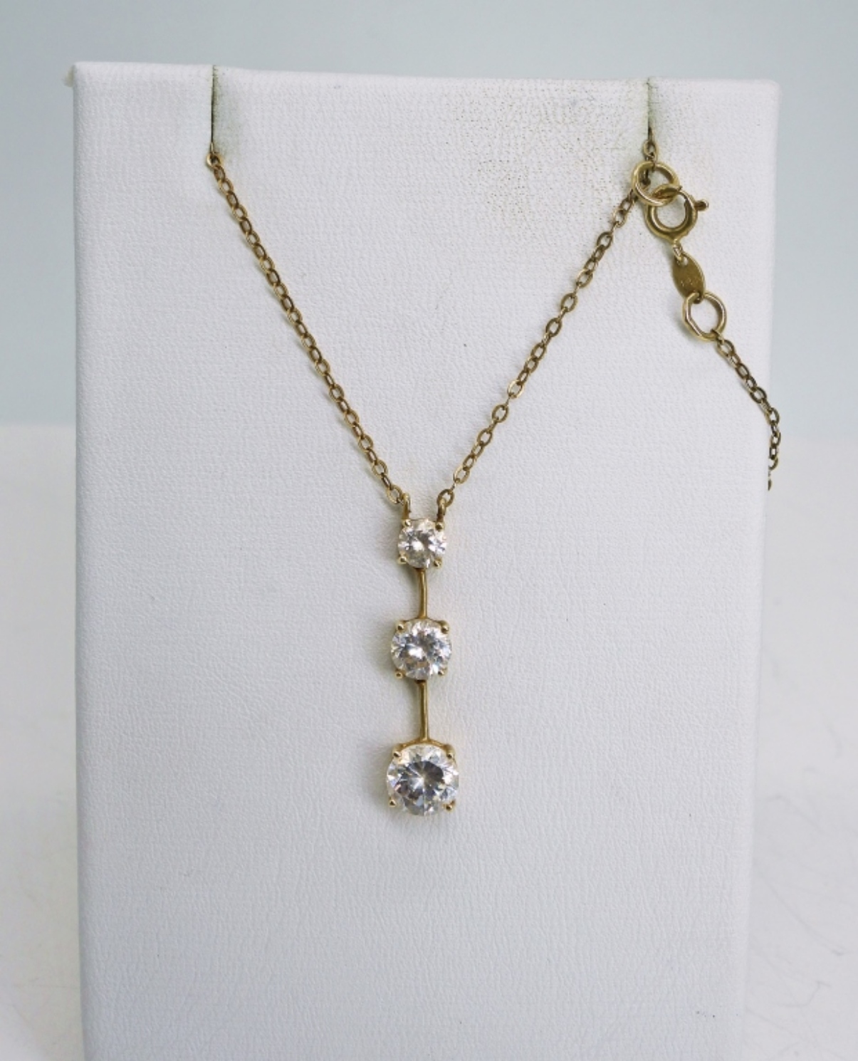 14K Yellow Gold 16″ Necklace. Pendant has 3 Diamond Colored Gemstones. Marked 14K. 1.5 DWT