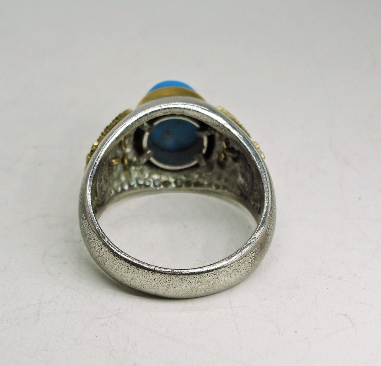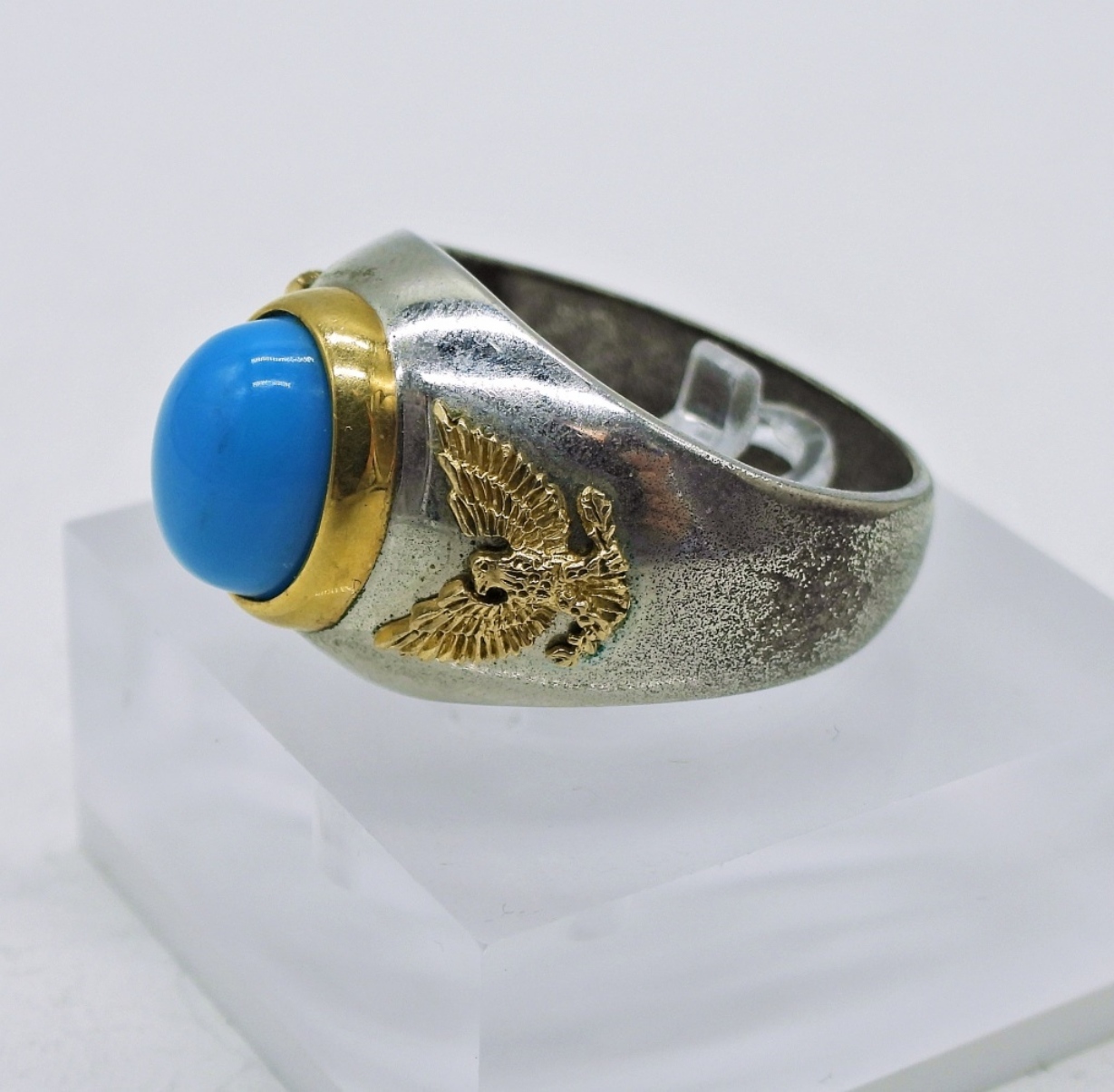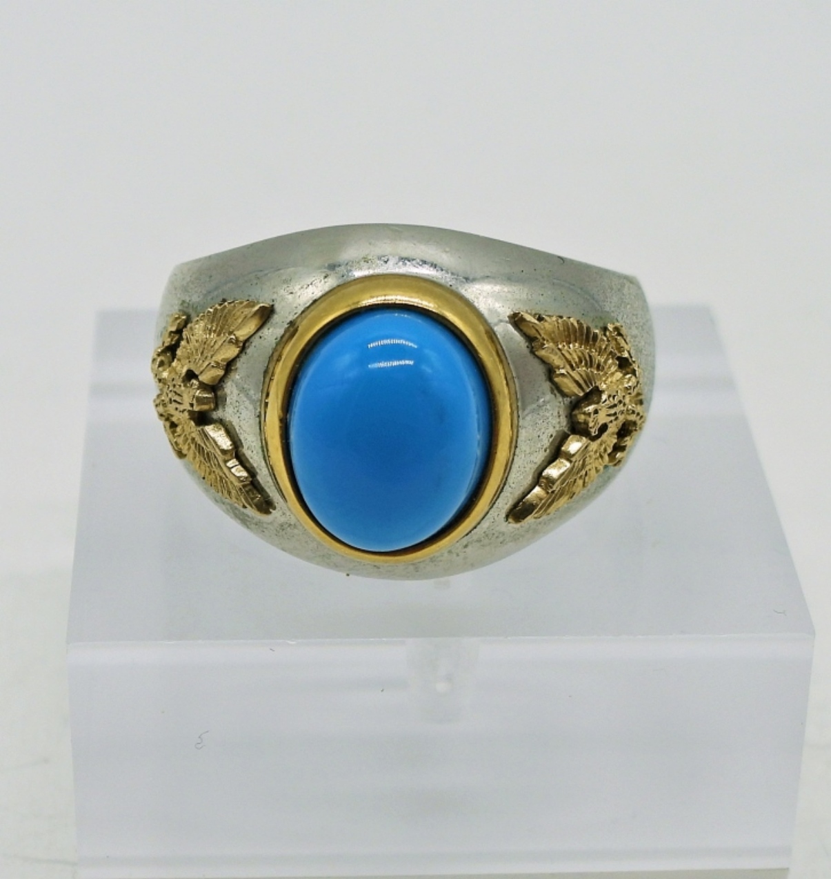 Sterling Silver Ring Size 11 3/4, Faux Turquoise. Eagles on side of Ring are 10K YG. Marked “925 Sterling” & “10K Eagles”. 9.4 DWT