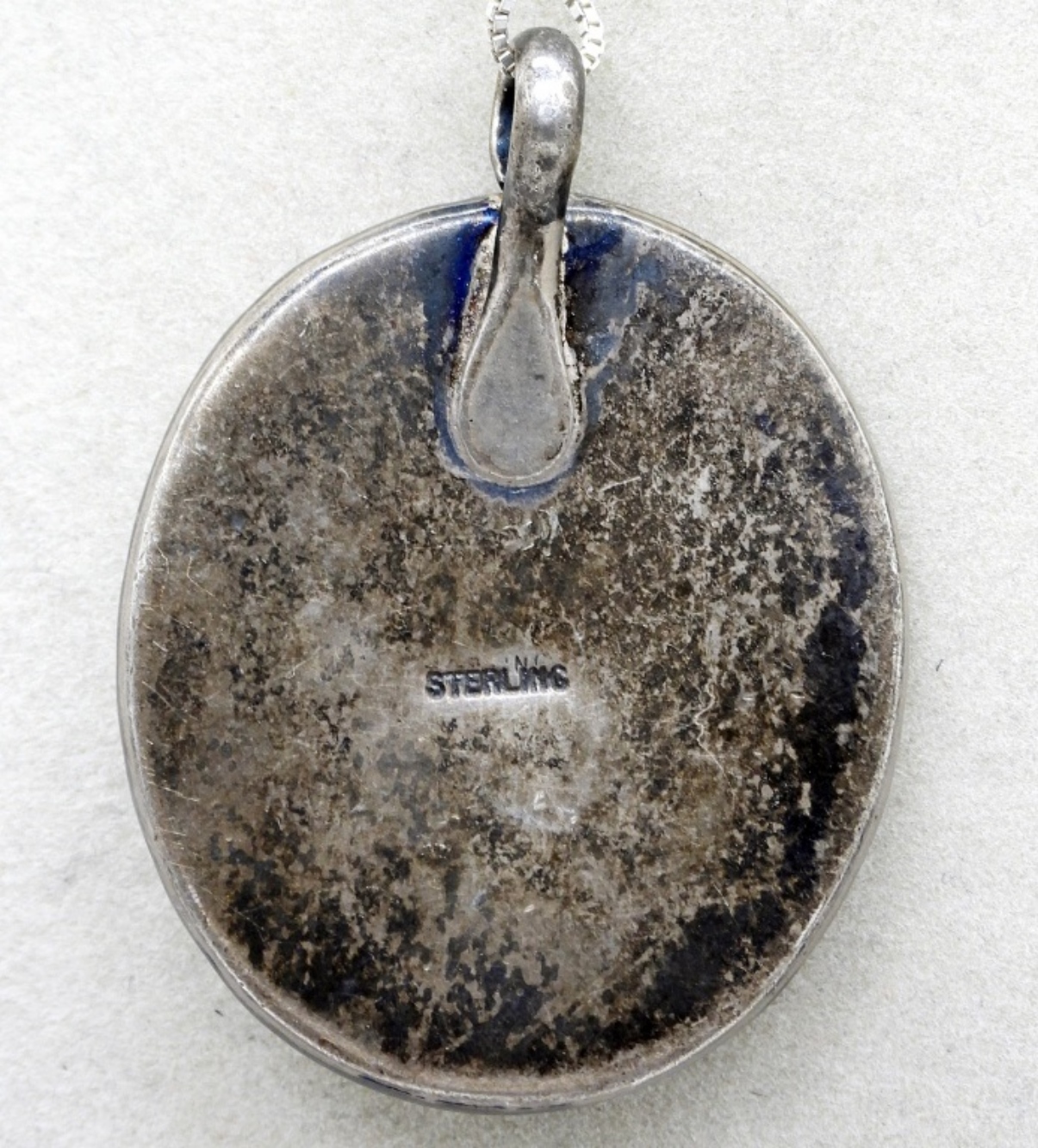 VINTAGE STERLING PAINTED COUPLE NECKLACE, 18″ STERLING CHAIN. 11.4 DWT