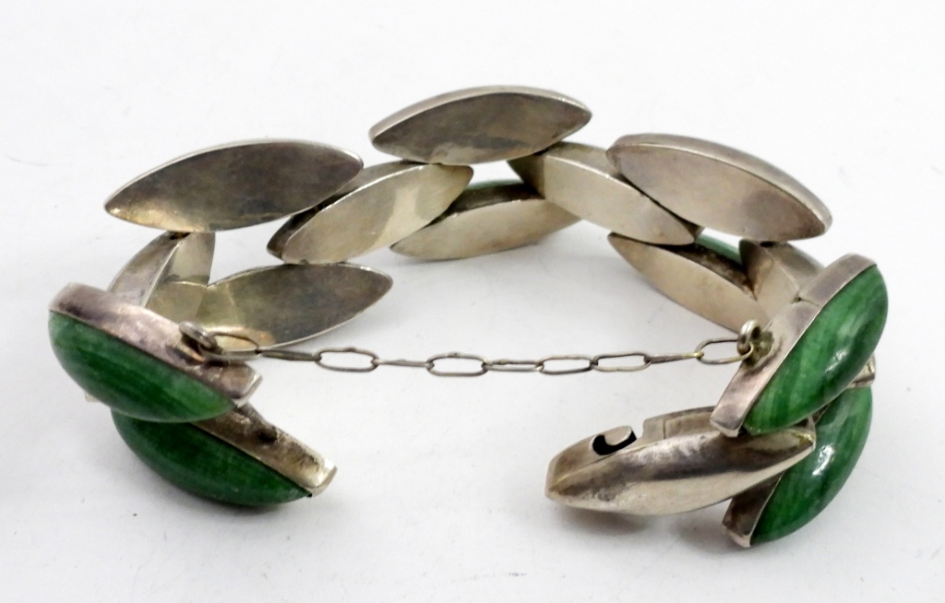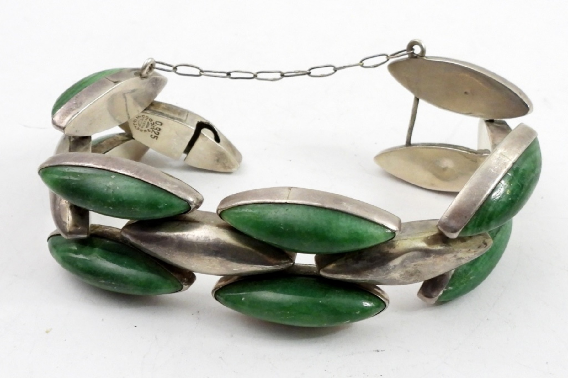 INCREDIBLE GREEN ONYX, STERLING MEXICO BRACELET. VERY UNIQUE CLASP, STURDY PIECE! 49 DWT