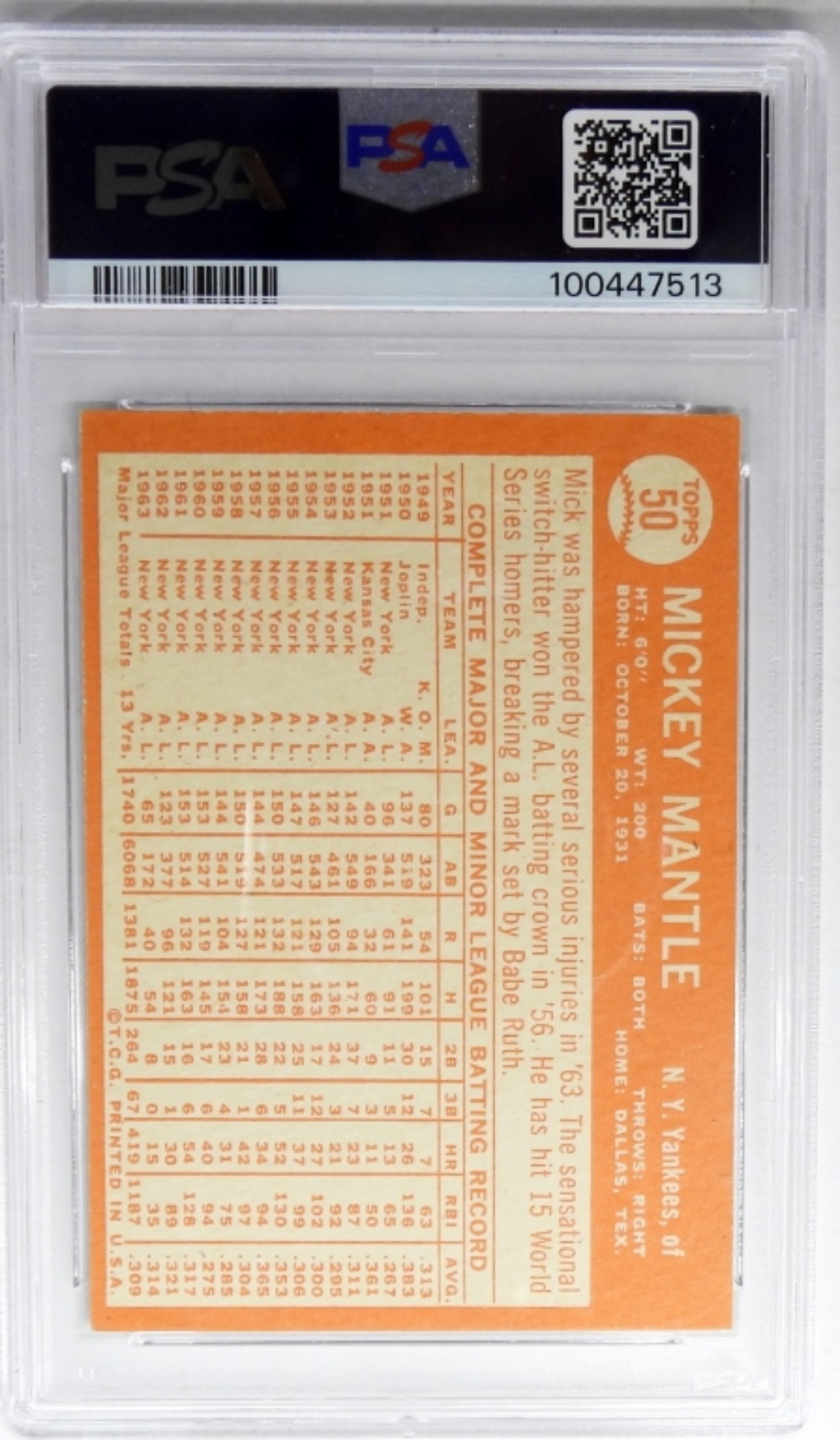 1964 TOPPS #50 MICKEY MANTLE PSA 5 EX