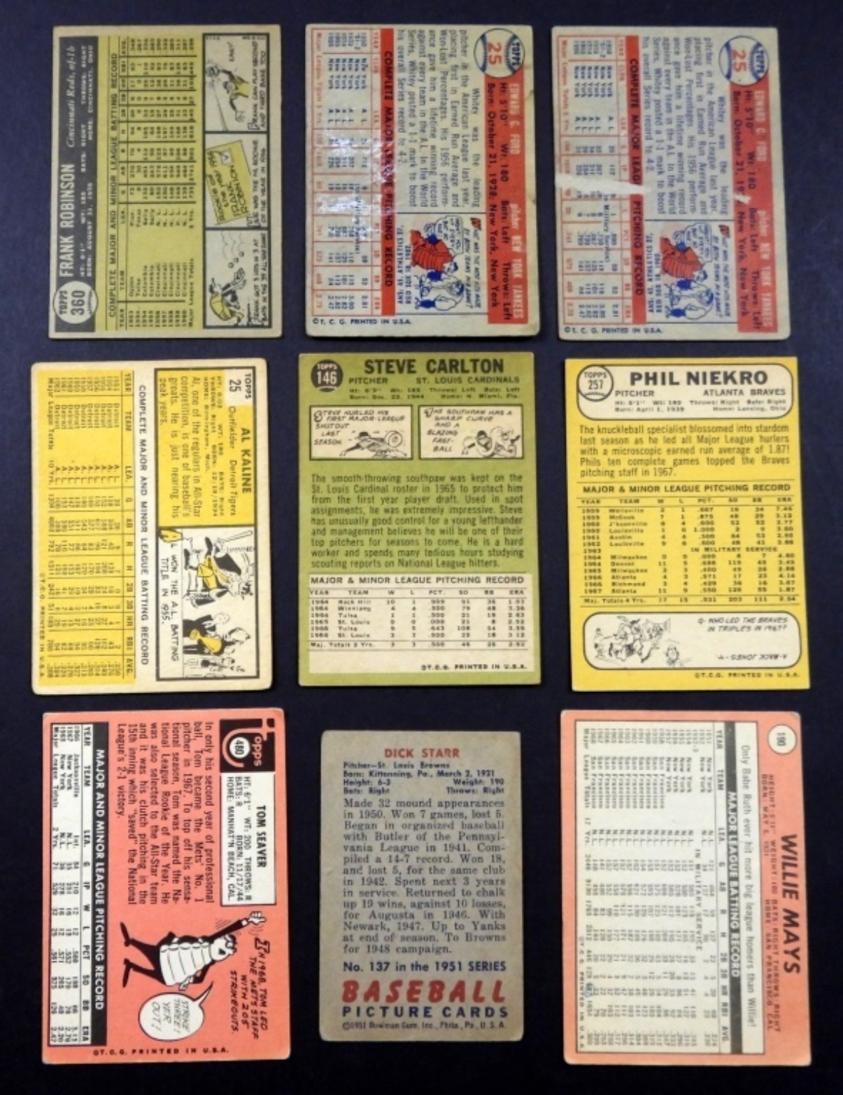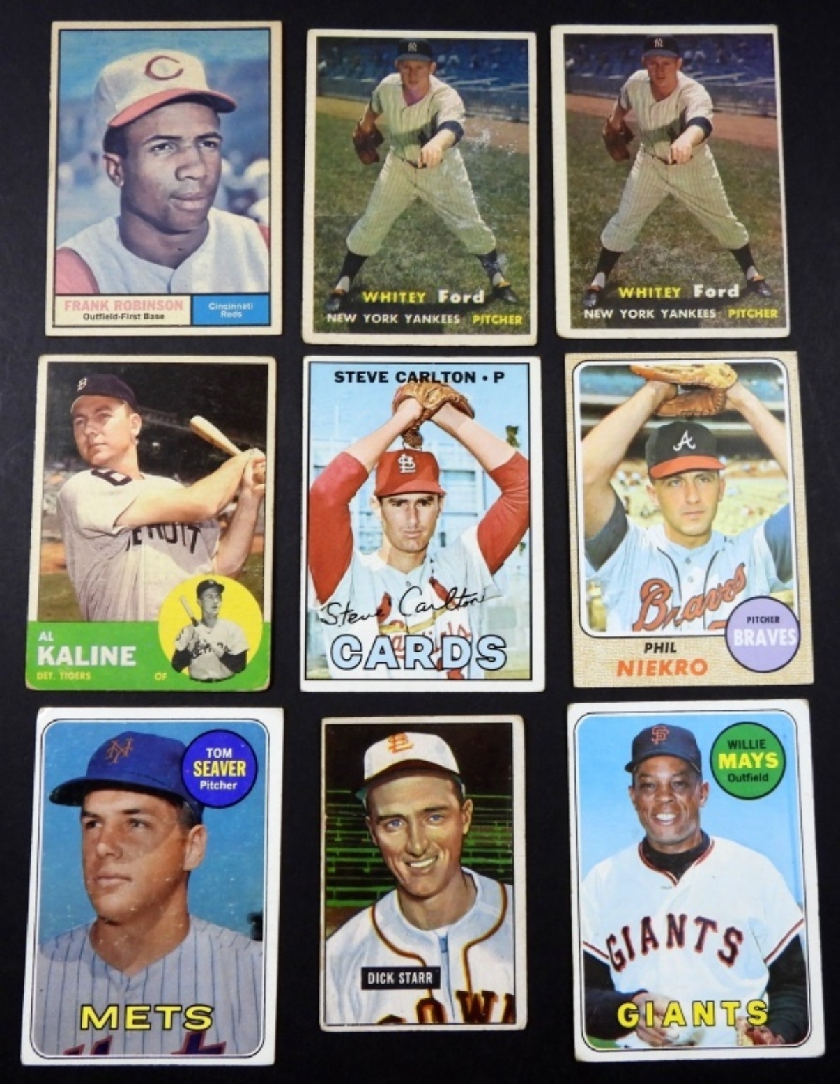 (2) 1957 TOPPS WHITE FORD VG/GOOD, 1969 TOPPS MAYS & SEAVER VG/VGEX, 1961 TOPPS F ROBINSON VGEX, 1963 TOPPS KALINE VG/GOOD & MORE
