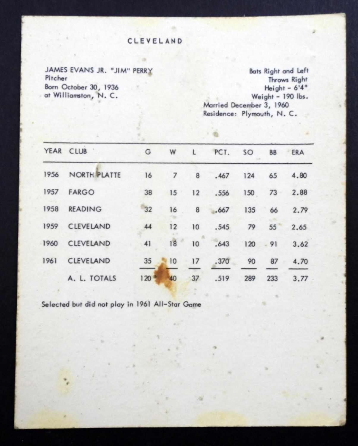 1961 KAHN’S WIENERS JIM PERRY, CLEVELAND, NICE CONDITION!