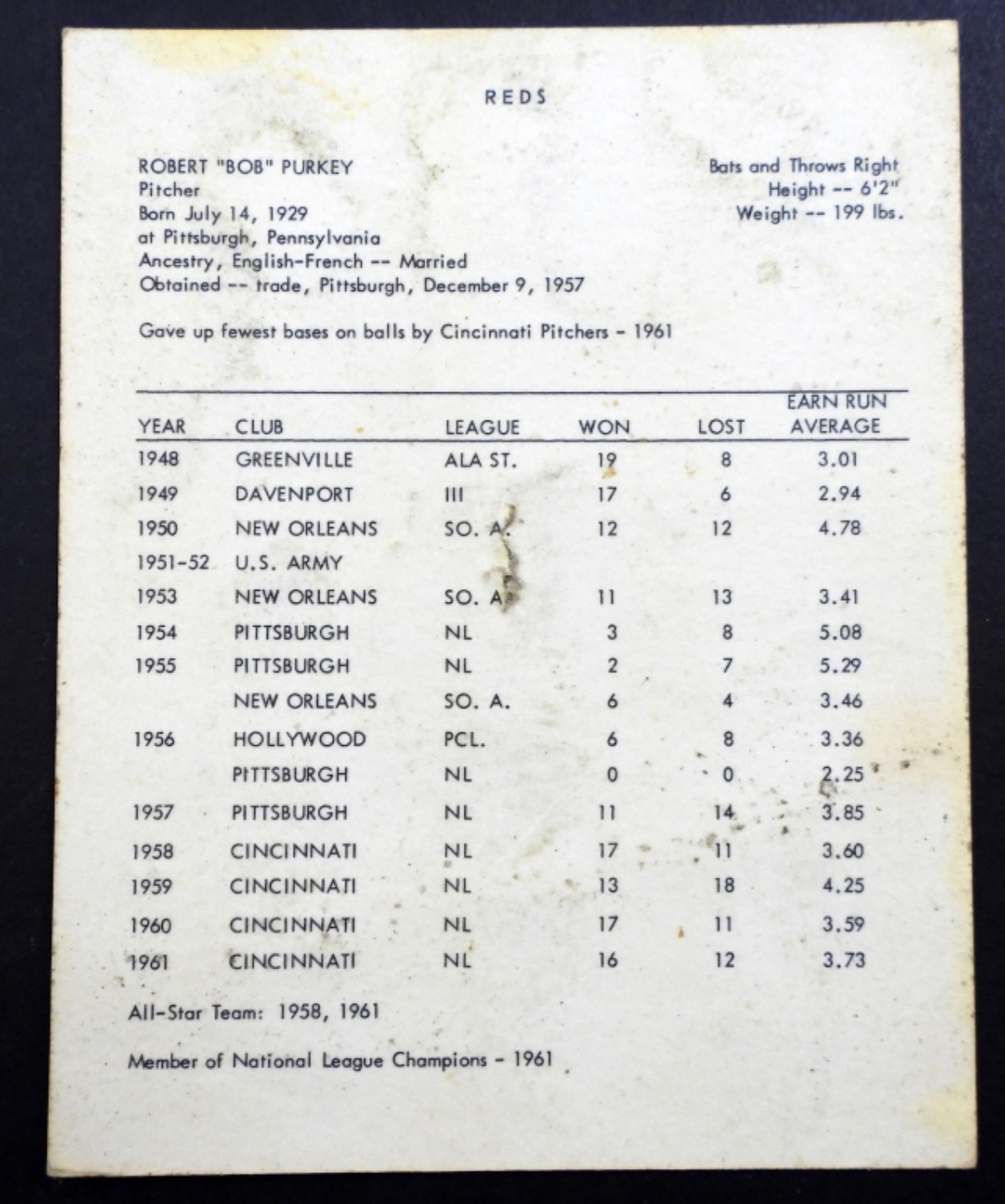 1961 KAHN’S WIENERS ROBERT “BOB” PURKEY. REDS NICE CARD
