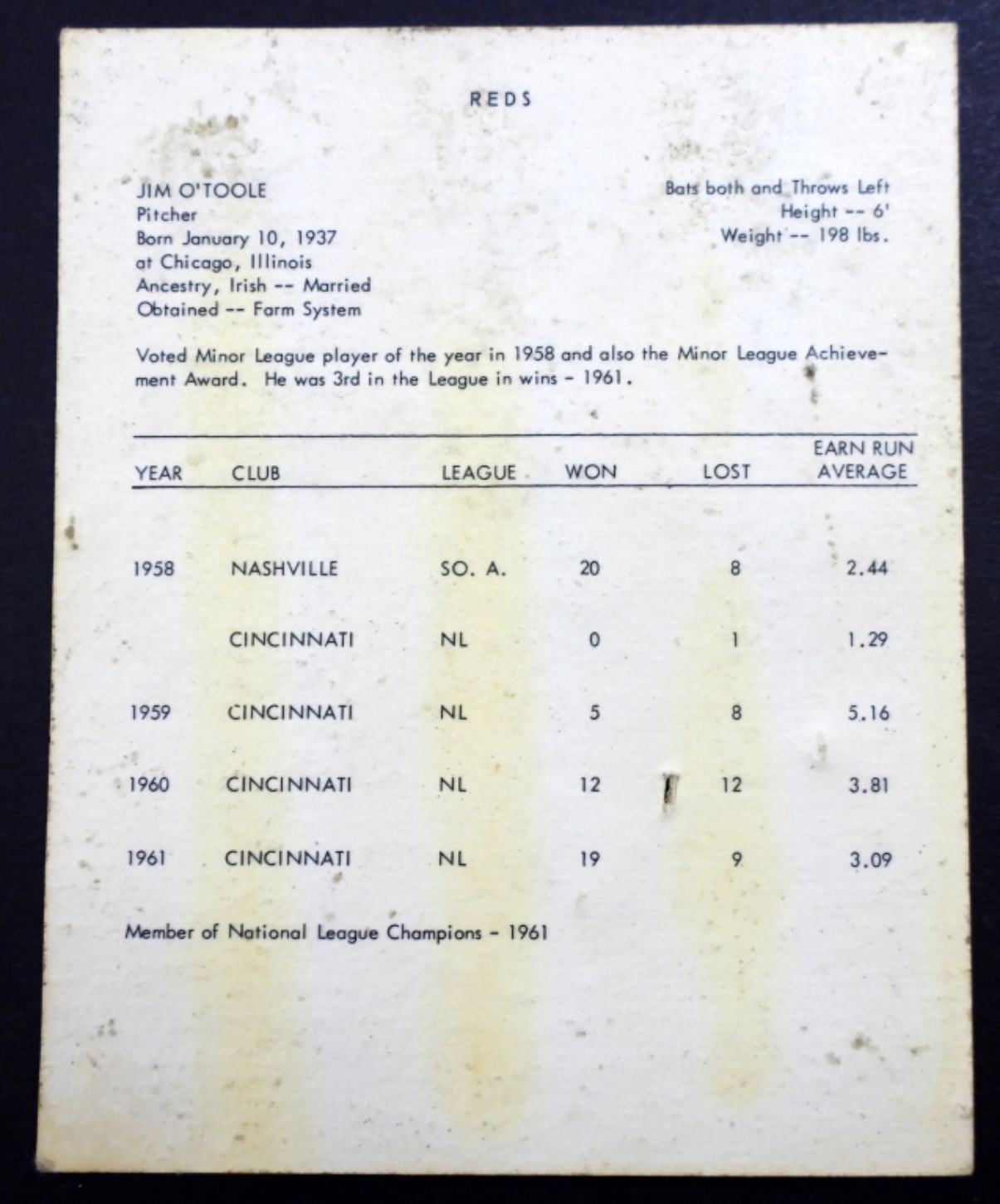 1960 KAHN’S WIENERS JIM O’ TOOLE, CINCINNATI REDS (VINTAGE)