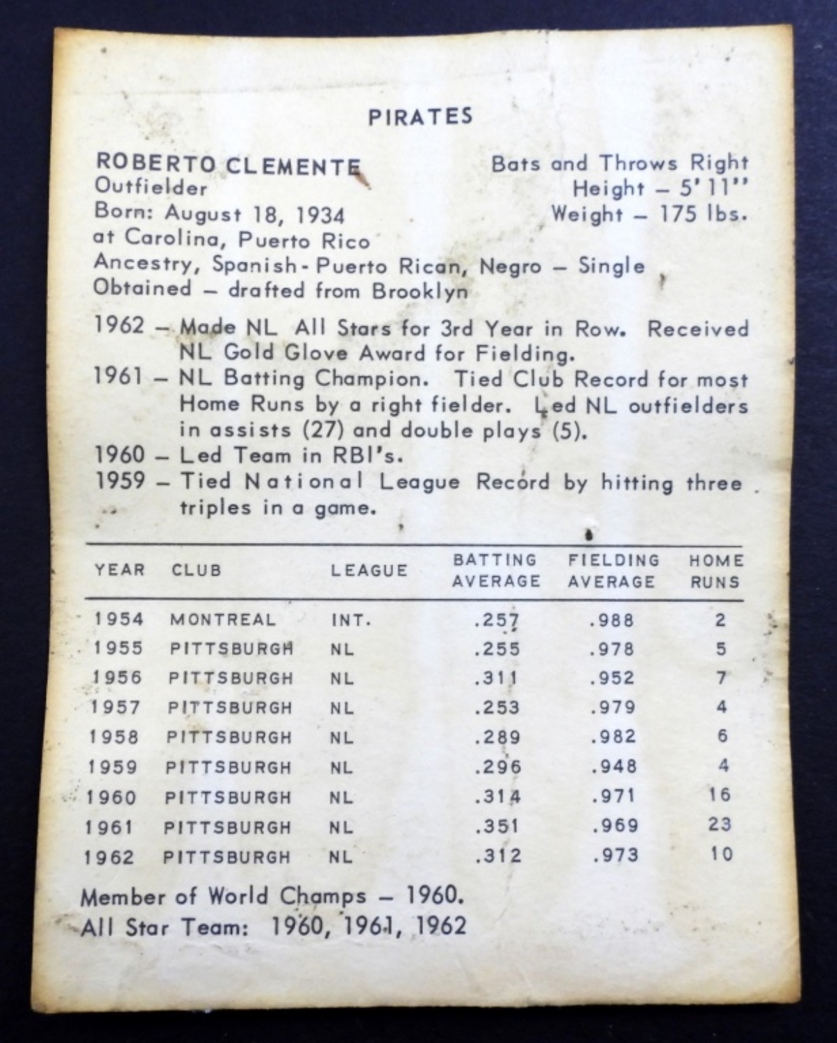 1963 KAHN’S WIENERS ROBERTO CLEMENTE, PIRATES , NICE CARD