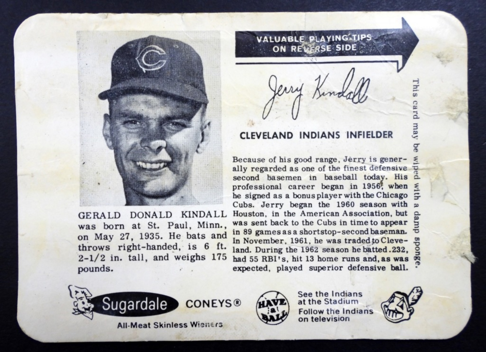 1963 SUGARDALE WIENERS #13 JERRY KINDALL, CLEVELAND INDIANS.