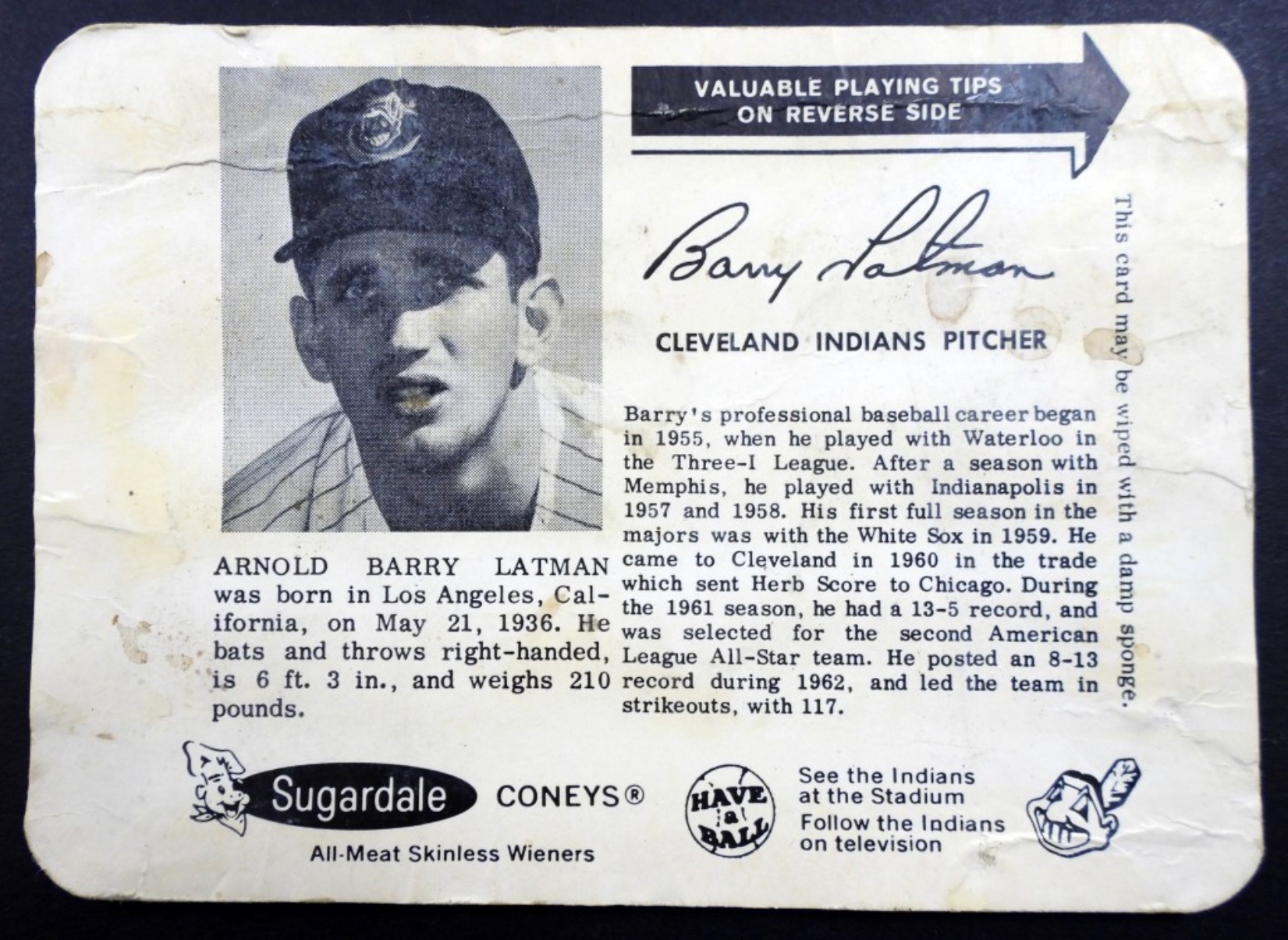 1963 SUGARDALE WIENERS #1 ARNOLD BARRY LATMAN,CLEVELAND INDIANS