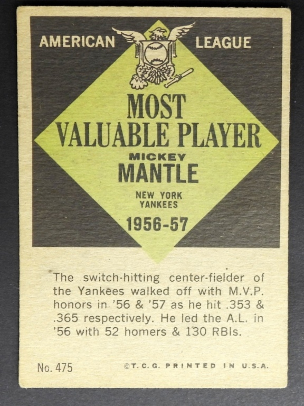 1961 TOPPS#475 MICKEY MANTLE MVP VG+
