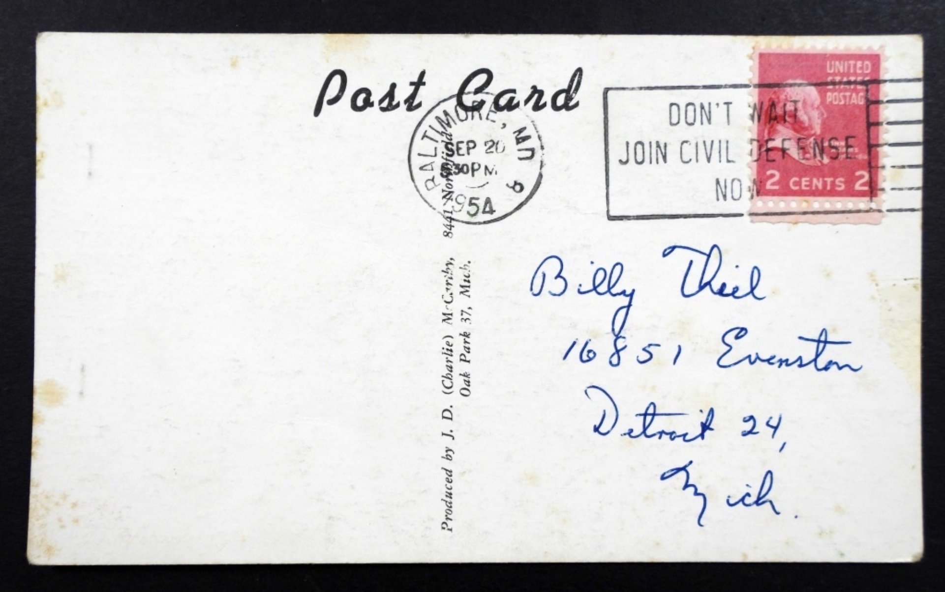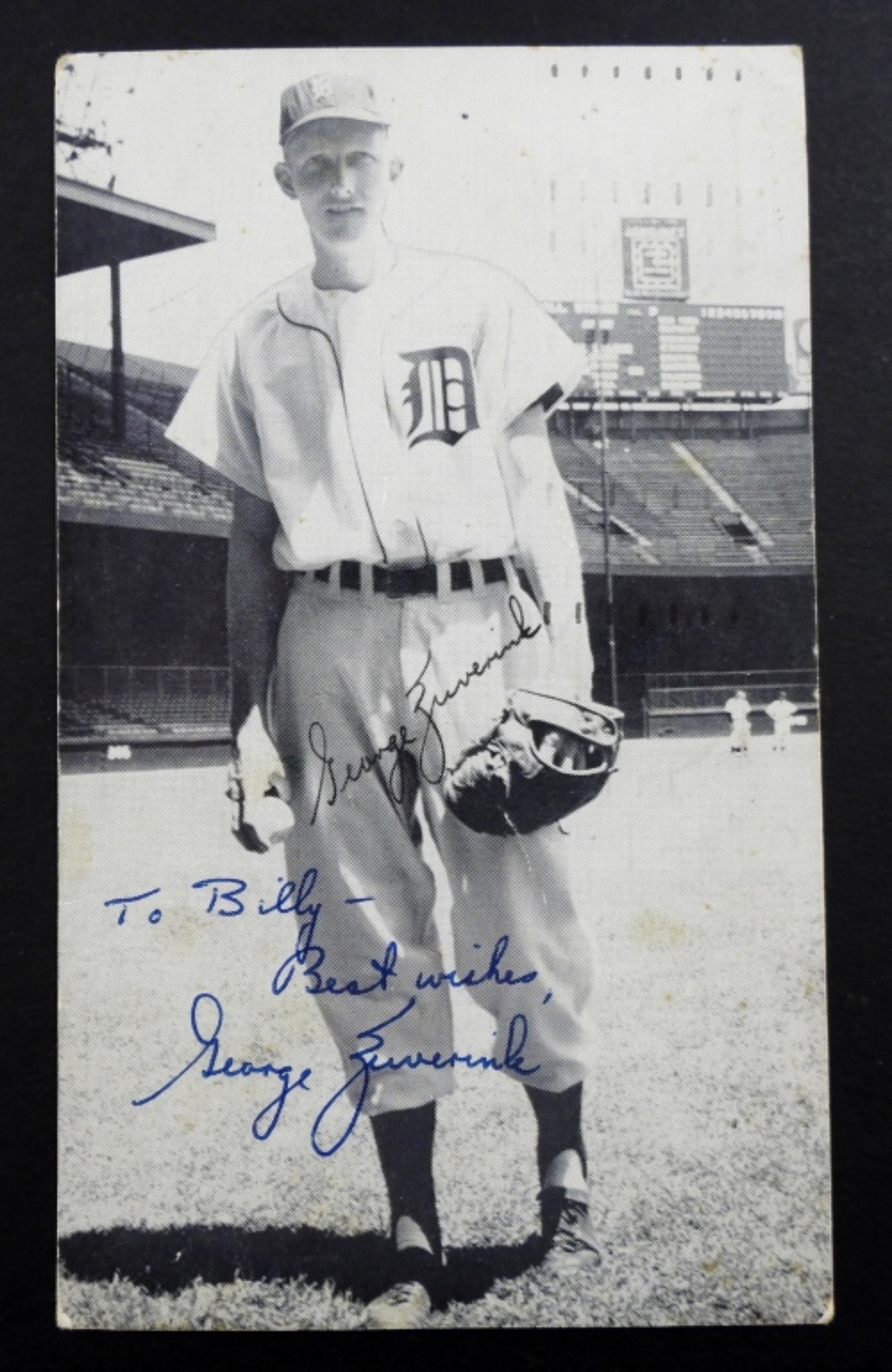 VINTAGE 1954 GEORGE ZUVERINK DETROIT TIGERS, AUTOGRAPHED J.D.MC.CARTHY POSTCARD ( NO COA)