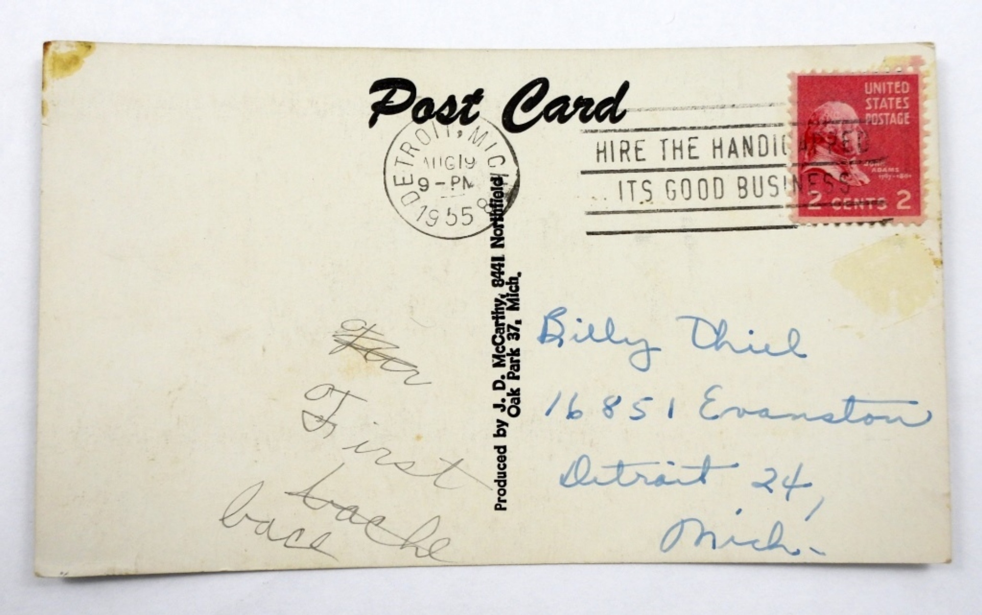 VINTAGE 1955 EARL TORGESON AUTOGRAPH J.D. MC CARTHY POSTCARD ( NO COA)